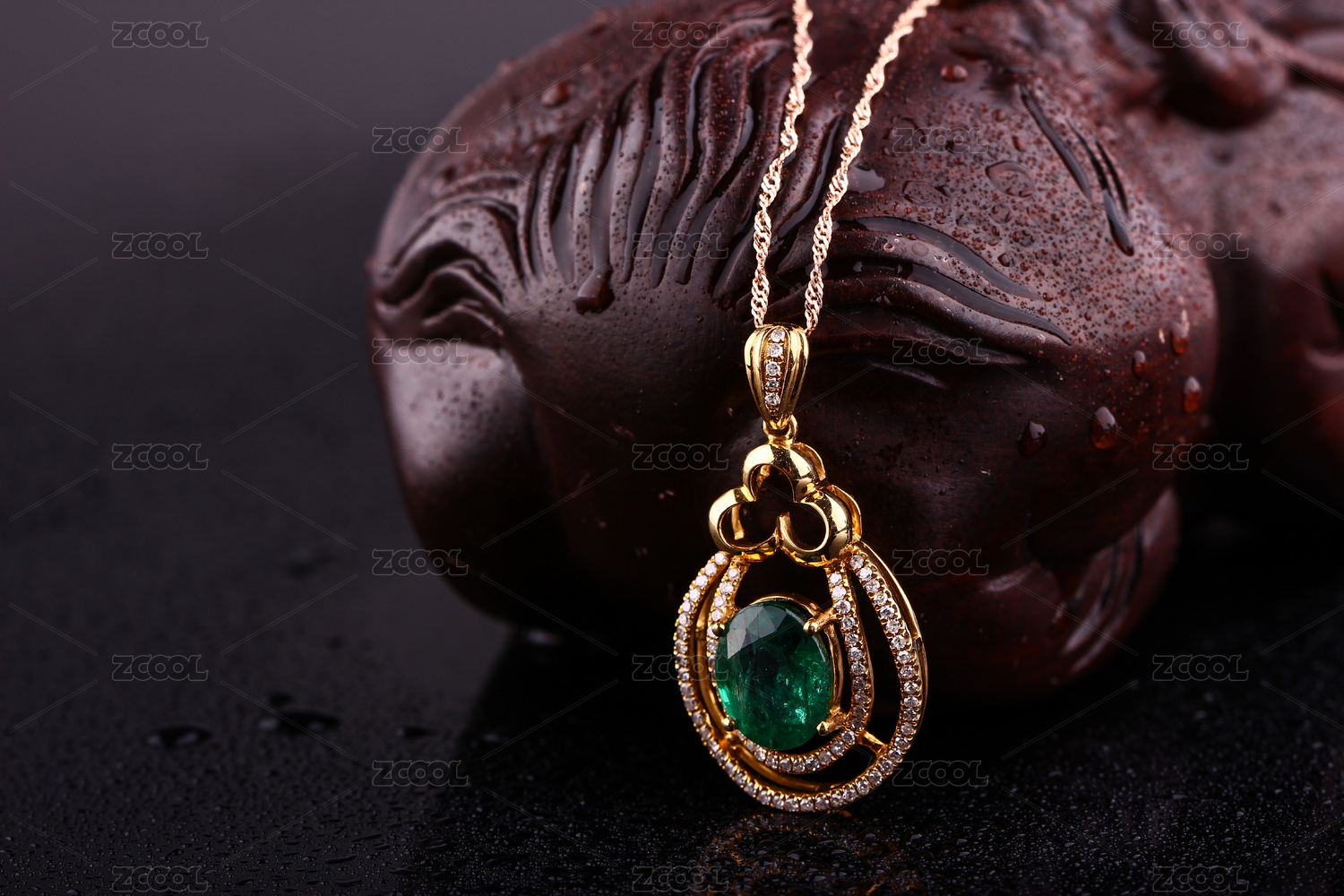 祖母绿宝石吊坠18K金晶亮的项链放在中式复古深色的背景里