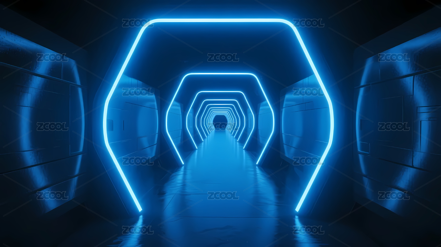 蓝色,灯光,六边形,墙壁,现代,白色,通道,延伸,隧道,地面