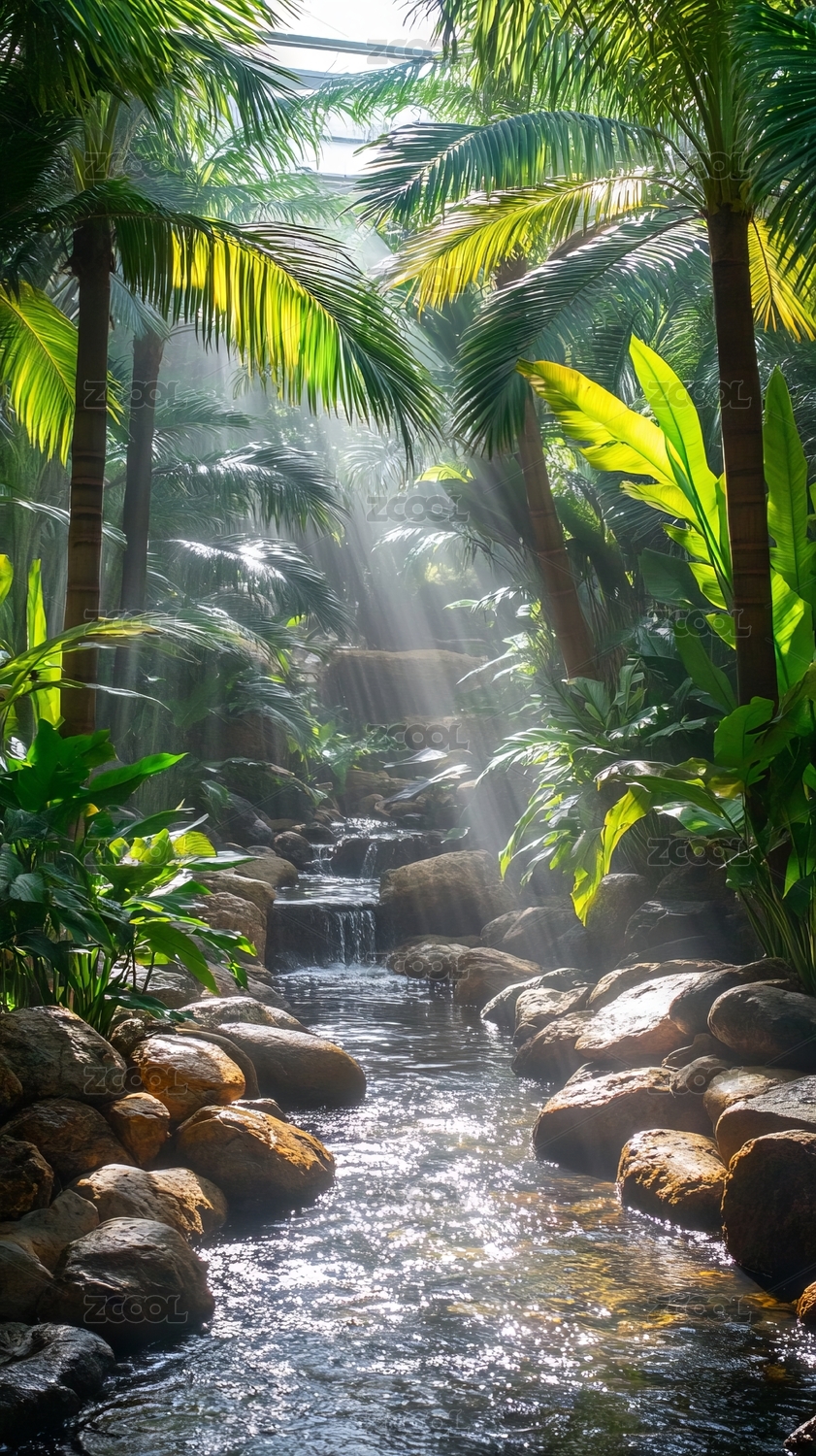 温室内的热带植物与溪流景观