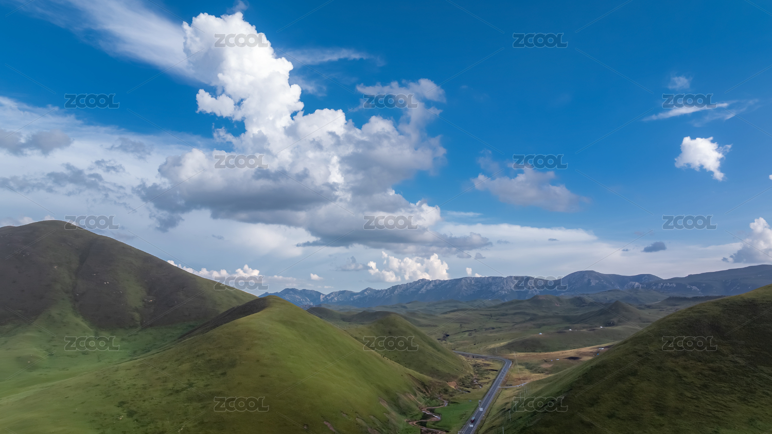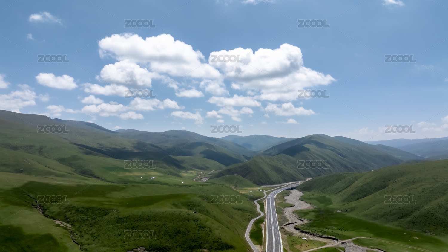 高原山谷绿色草地蓝天白云
