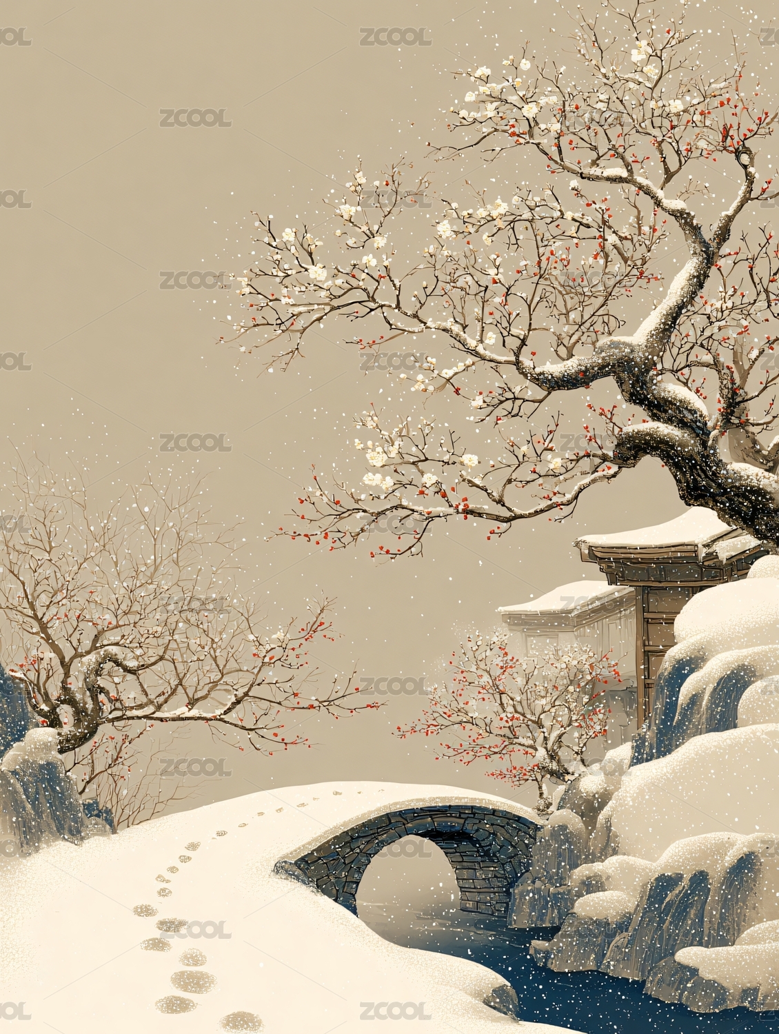 立冬节气下雪梅花开放意境冬景国风国潮插画