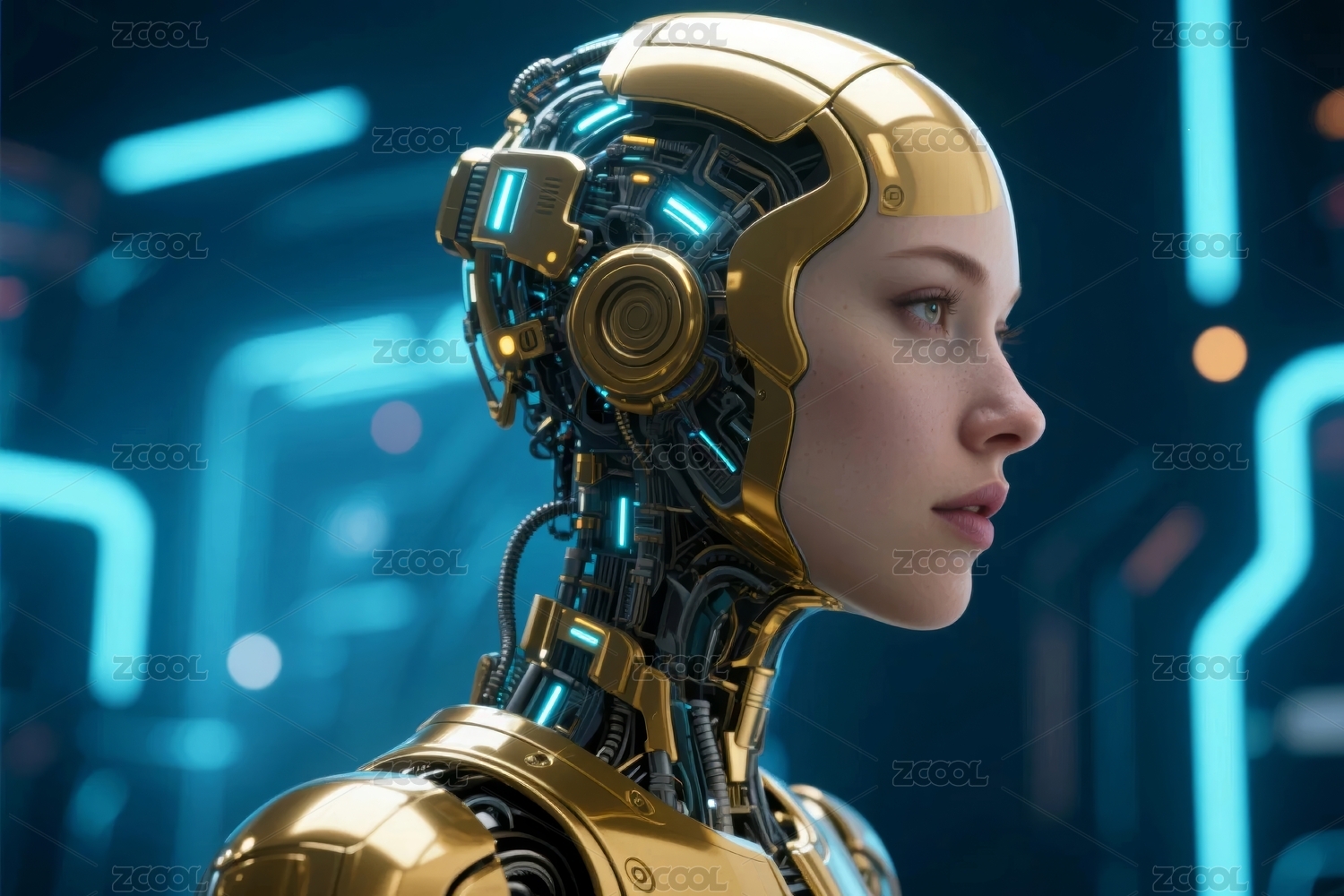 机器人,女性角色,高科技环境,蓝色灯光,未来感