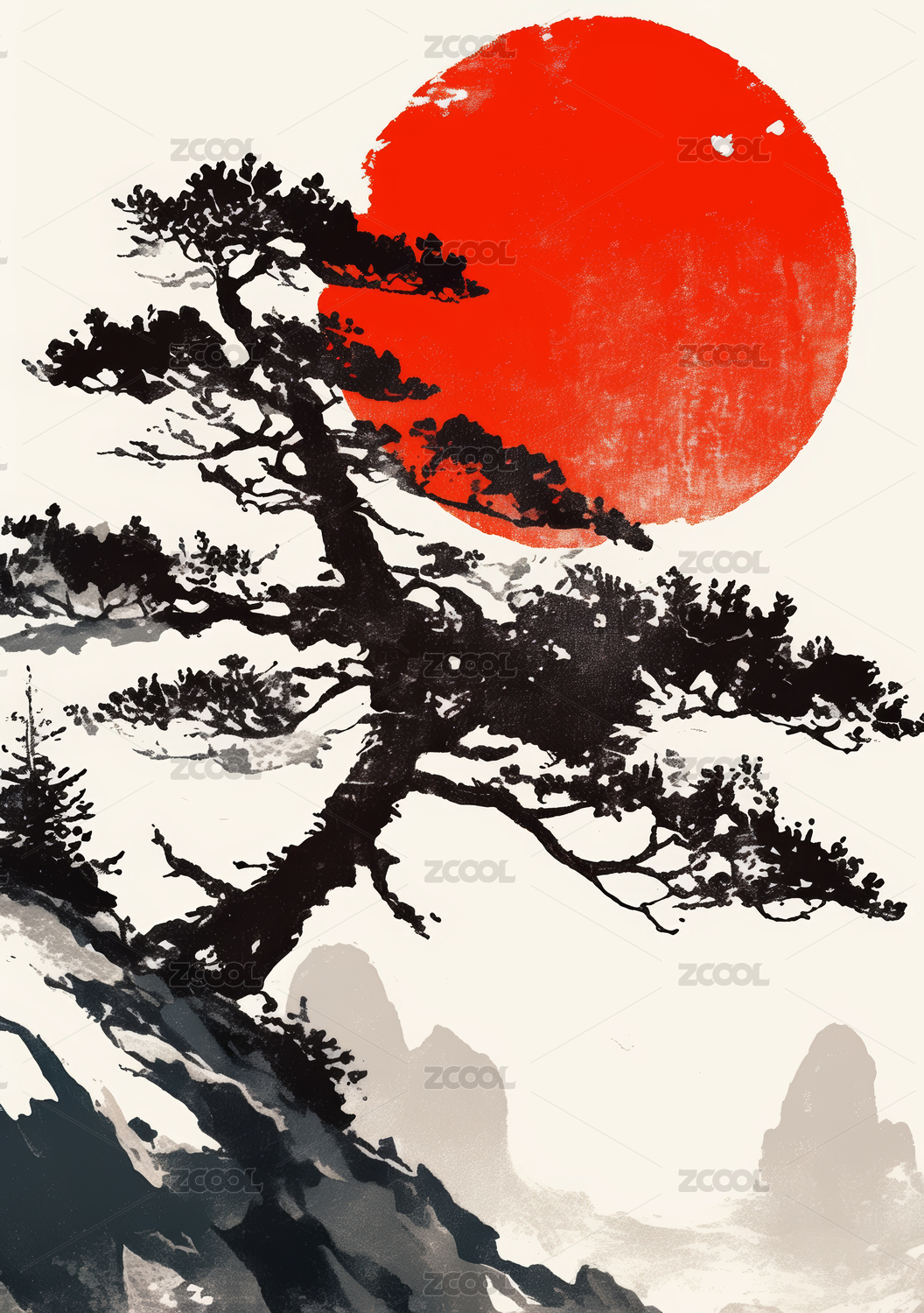 松树与红日的水墨画