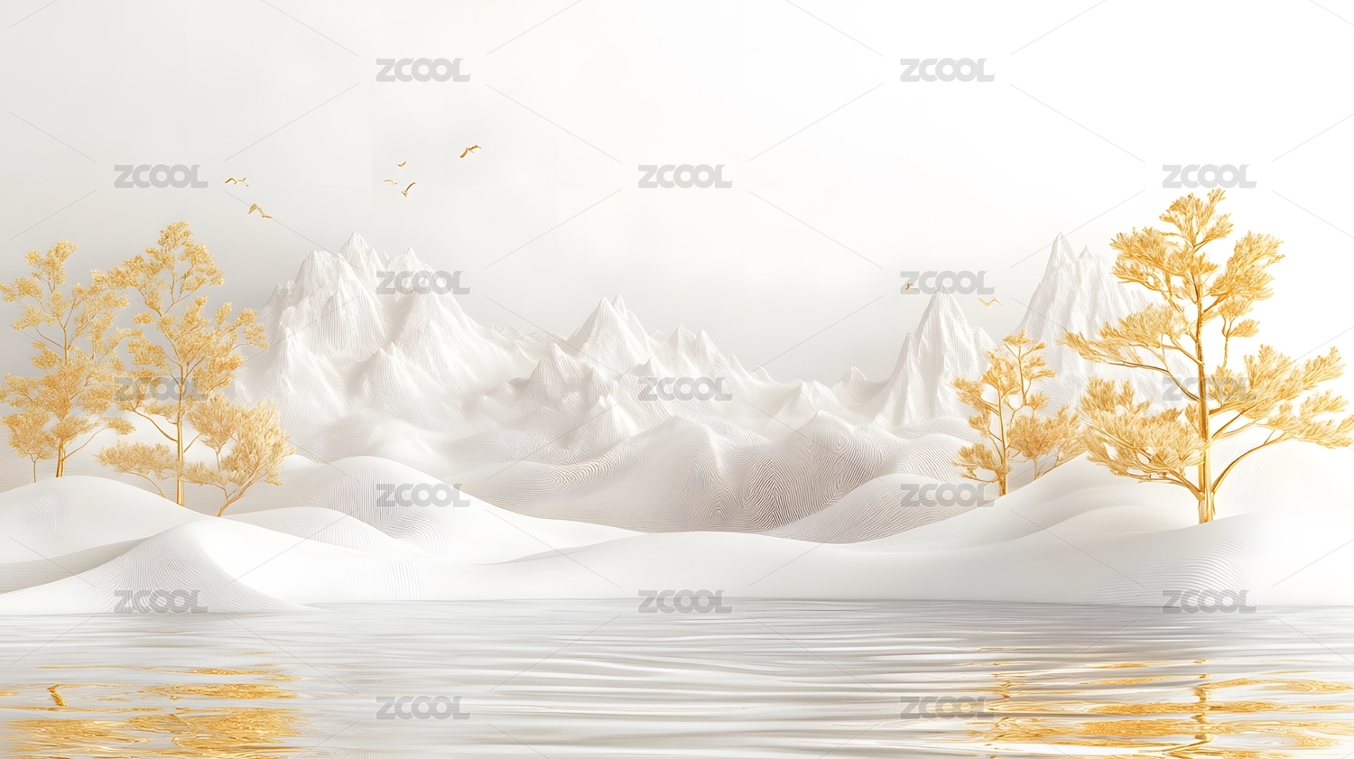金色树木与白色山峦的3D场景