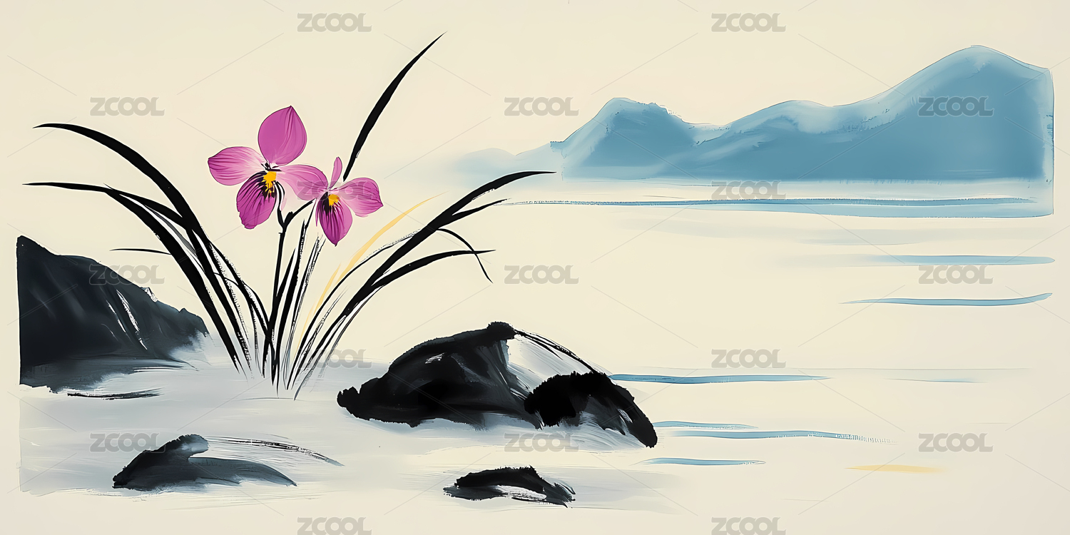 水墨兰花与岩石