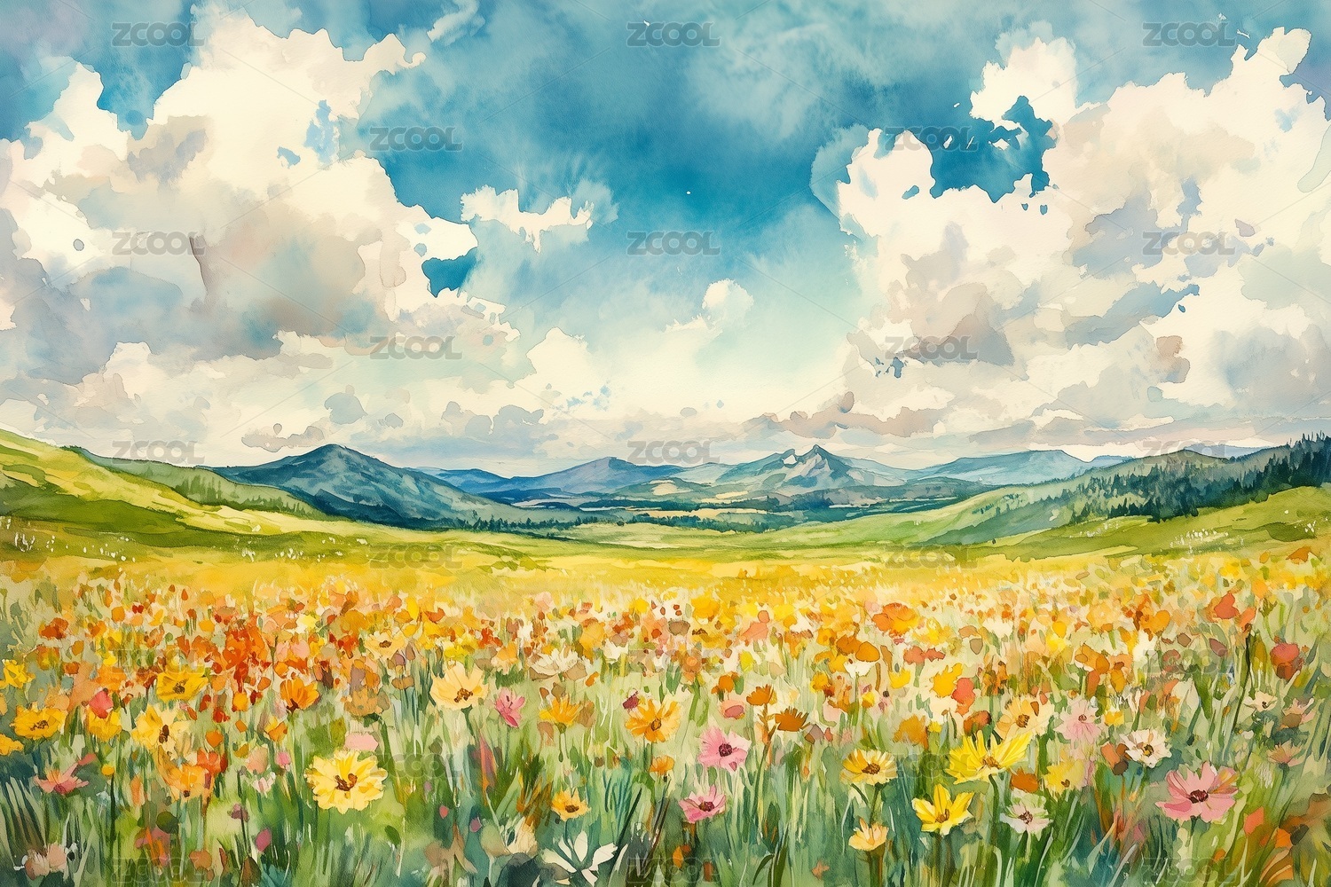 水彩风格高原草甸风光