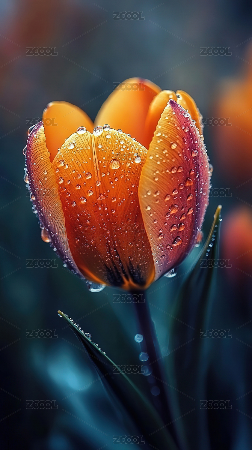 晨露滴落的橙红郁金香
