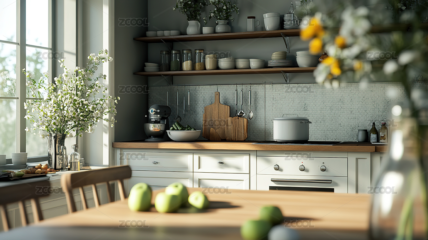 瓷砖,阳光,厨房,装饰,砧板,工具,木制品,背景墙,植物,绿植