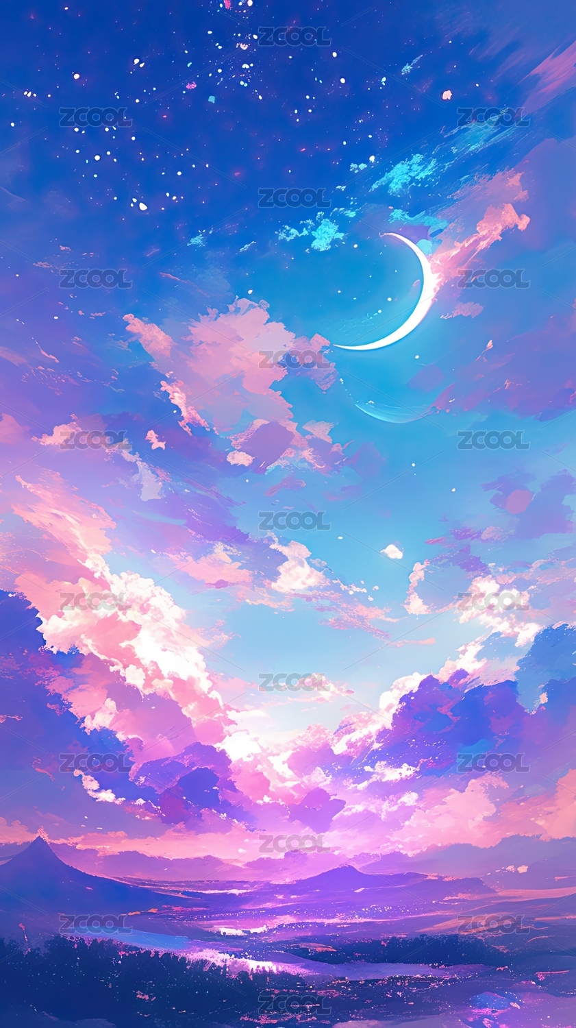 梦幻星空下的新月与彩云