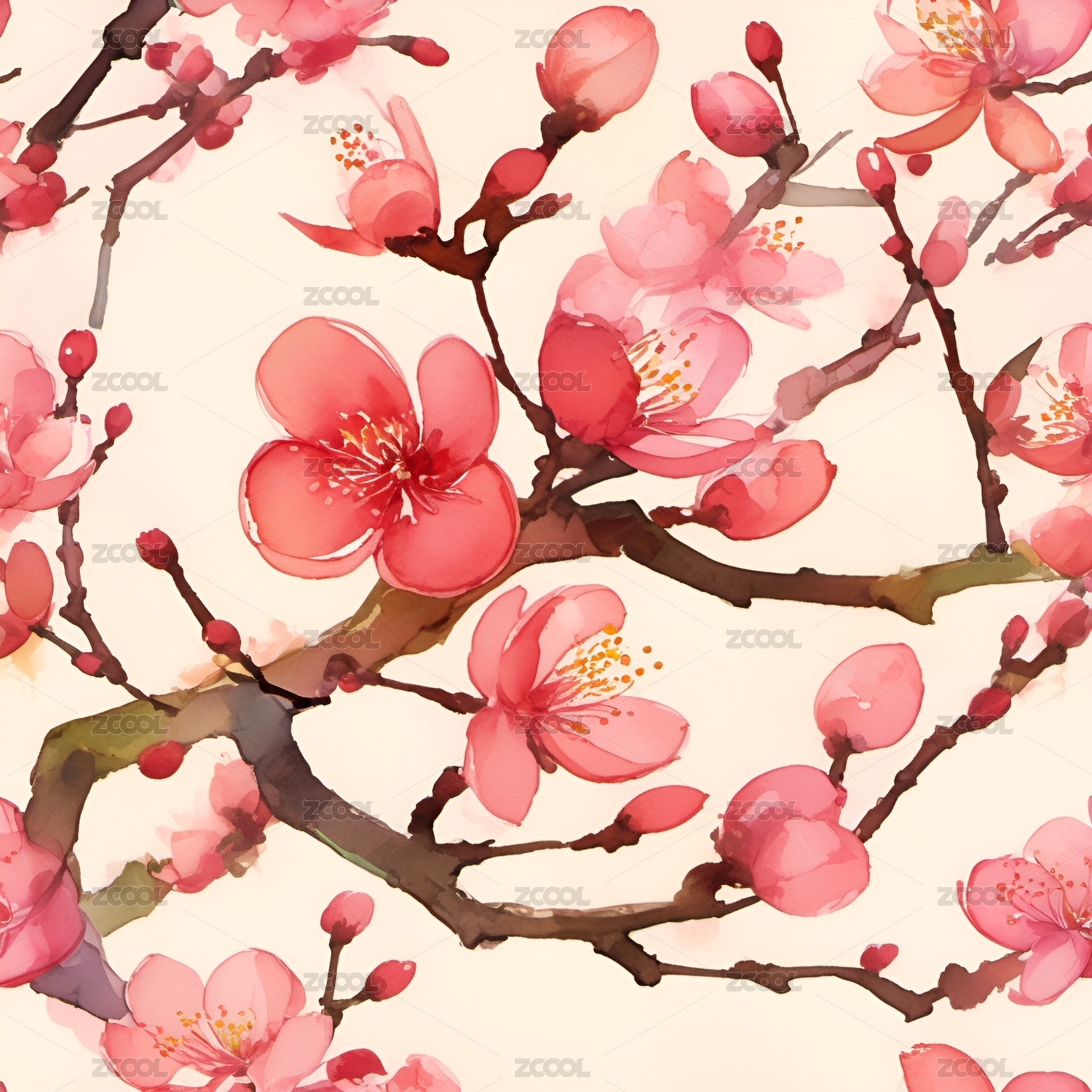 粉色梅花花枝植物水彩无缝图案纹理
