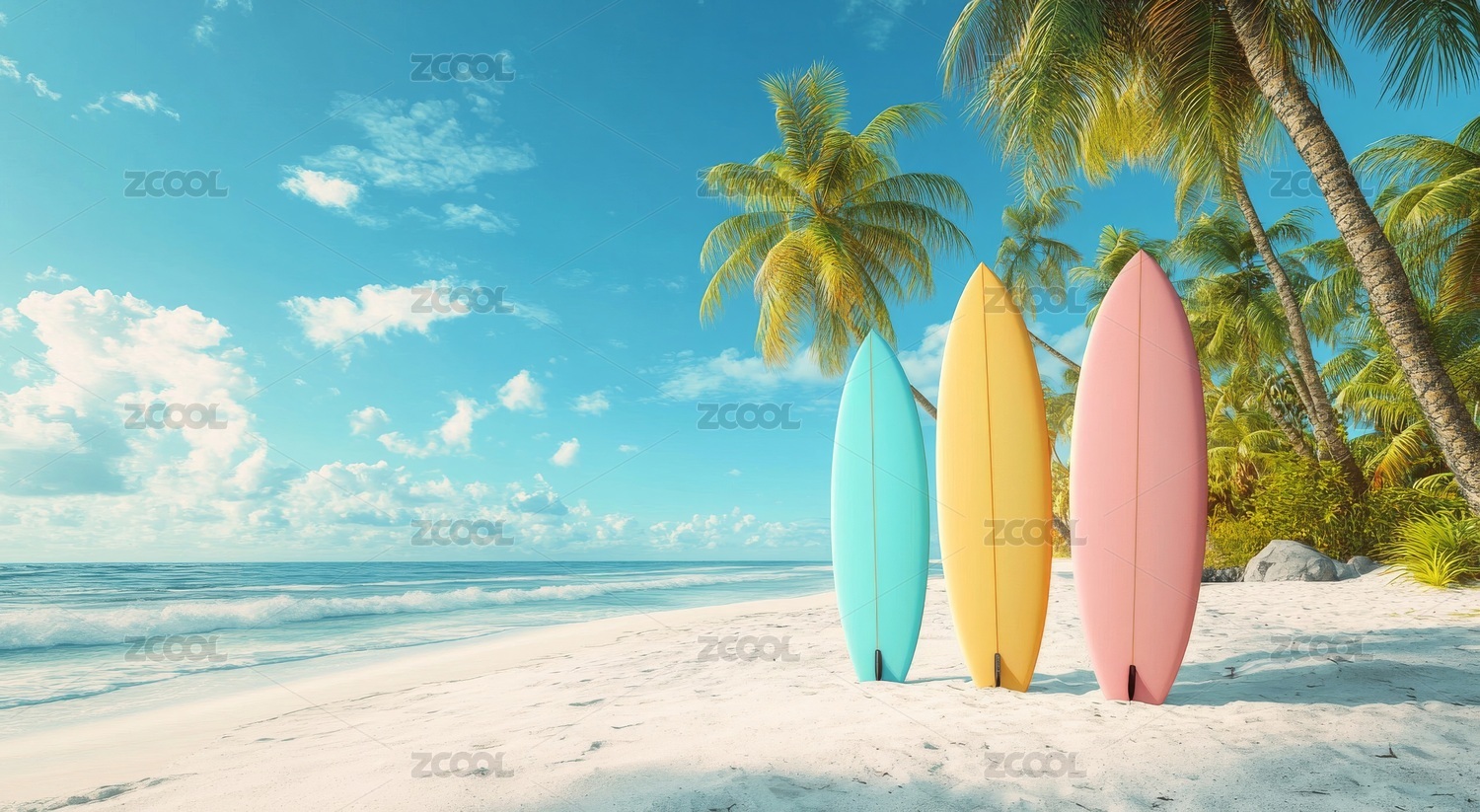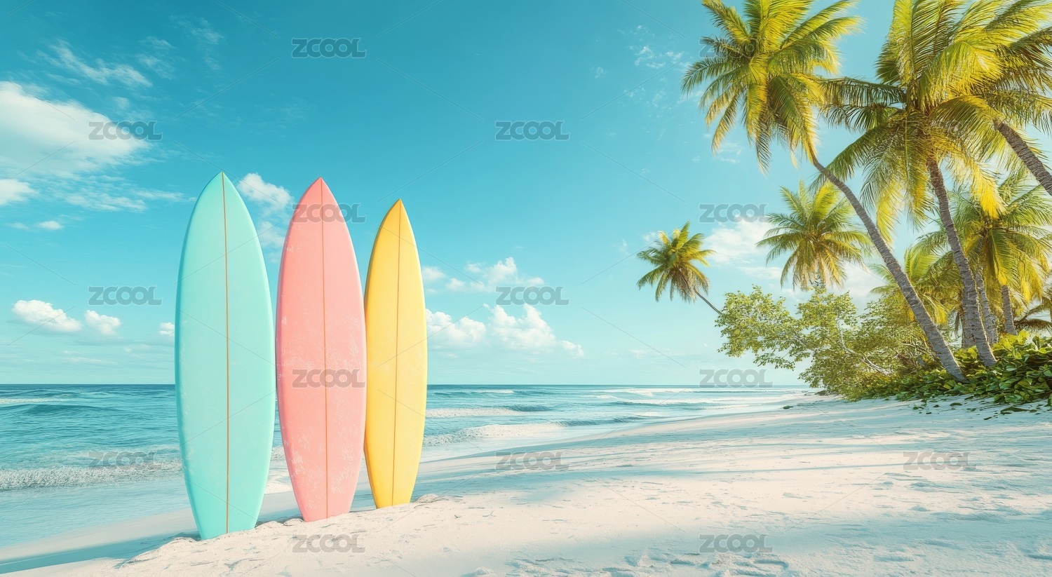 海滩,鹦鹉,冲浪板,小屋,棕榈树,太阳,蓝天,插画,海洋,度假