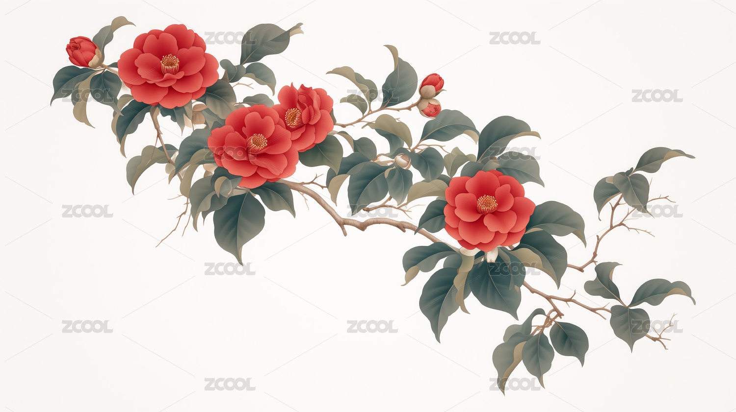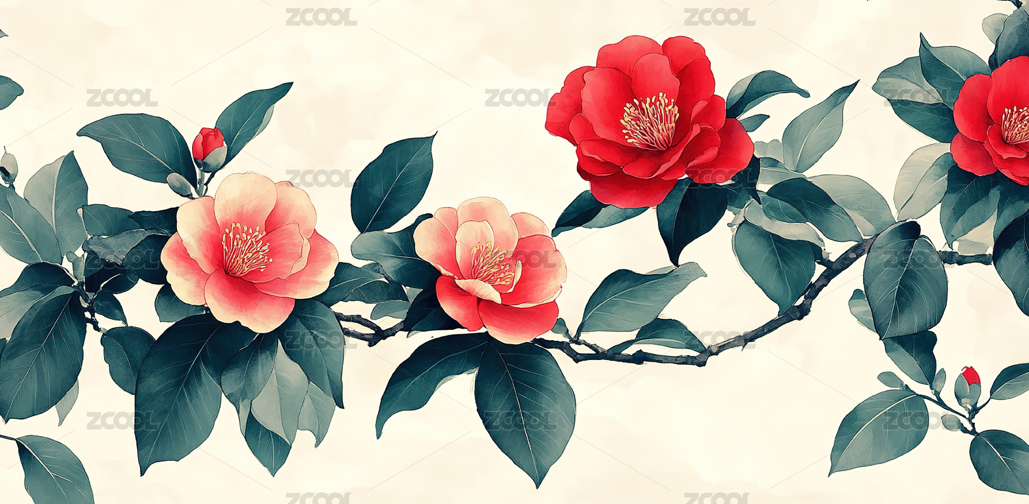中式风格盛开与含苞的山茶花