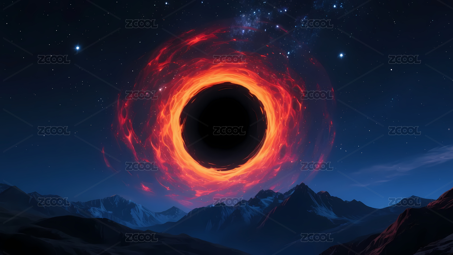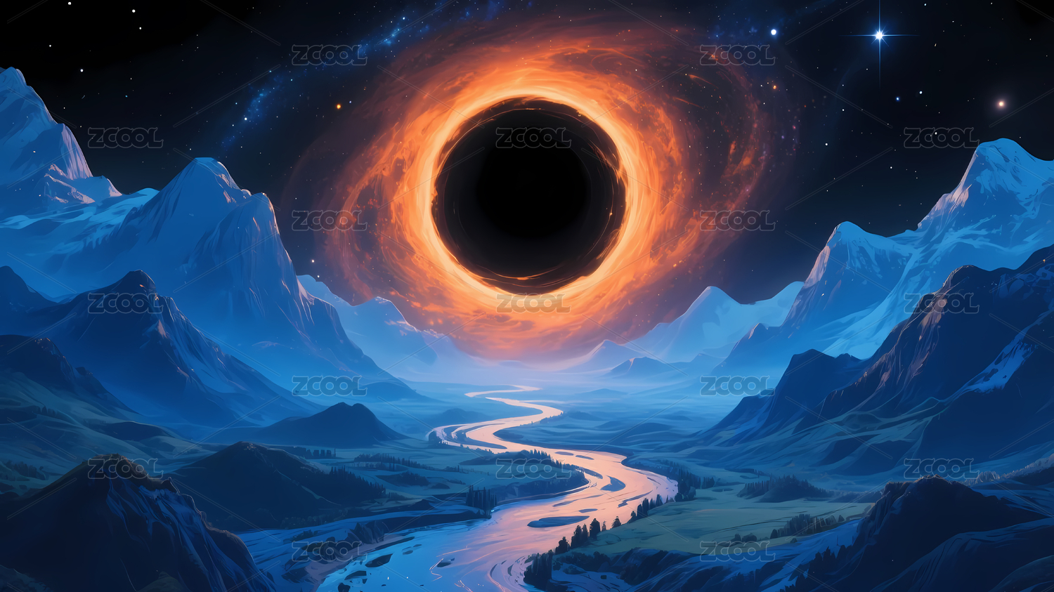 深黑,蓝色,紫色,黑洞,星空,雪山,河流,橙红,反射,蜿蜒