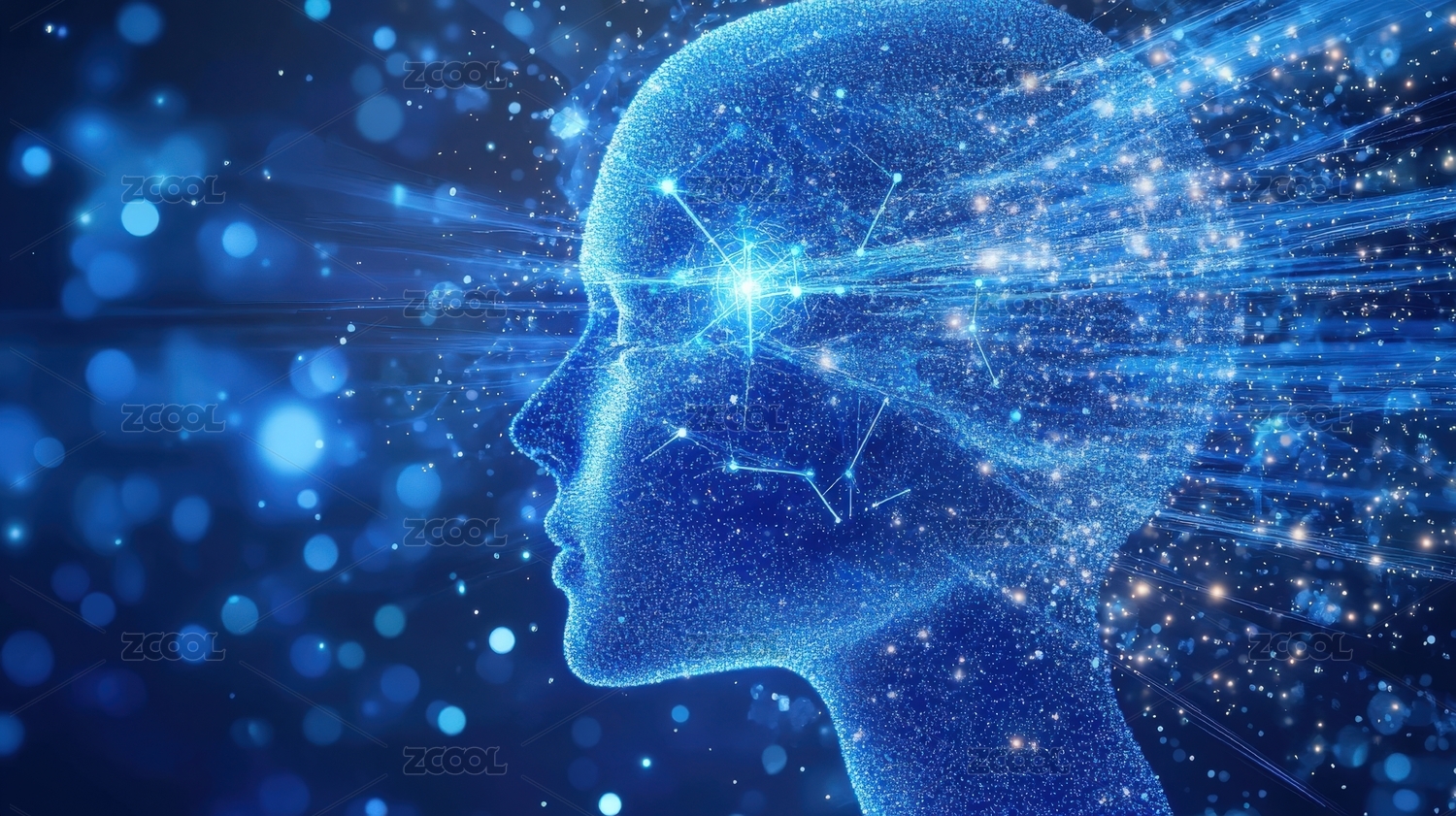 蓝色发光粒子生成人脸抽象虚拟人工智能插画