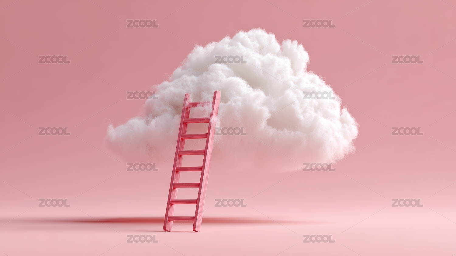 极简淡粉色背景幻想中通往一小朵白云的梯子