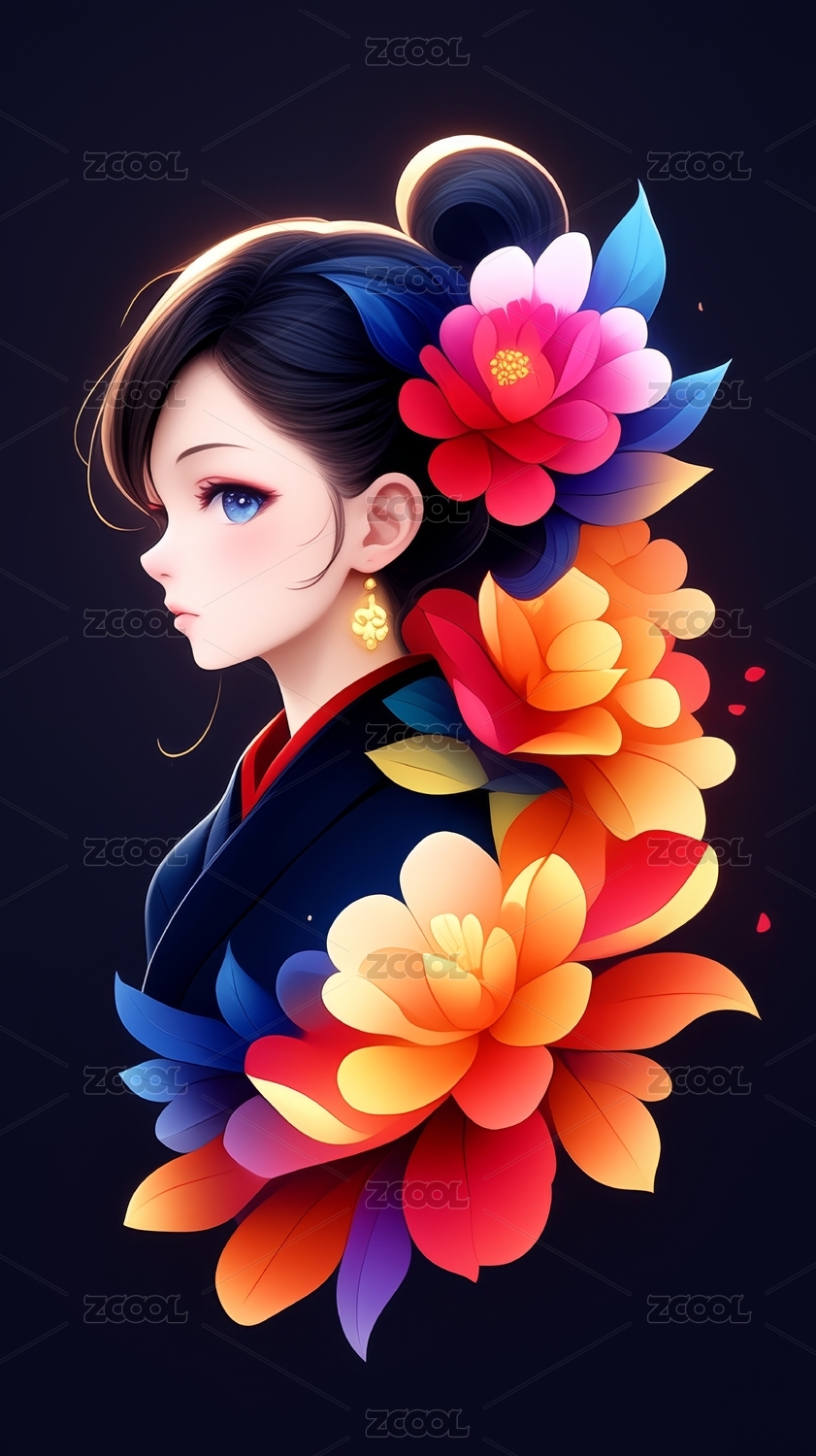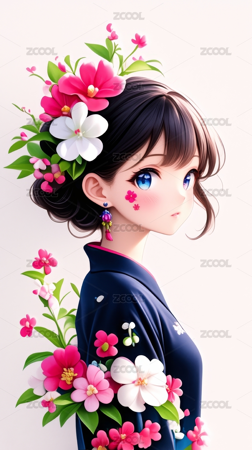 动漫女孩侧脸与花