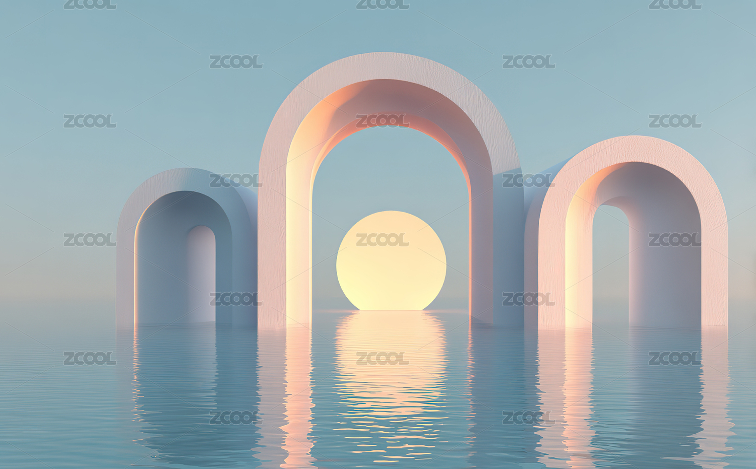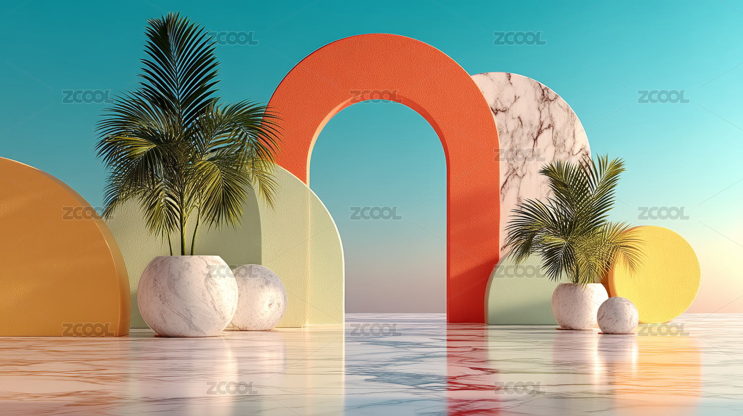 梦幻渐变空间中的绿植与拱门