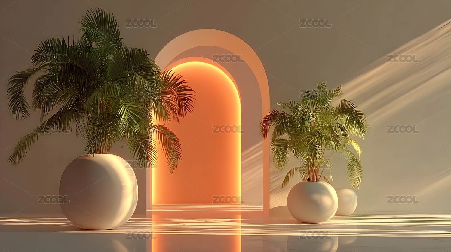 拱门与棕榈植物的室内光影