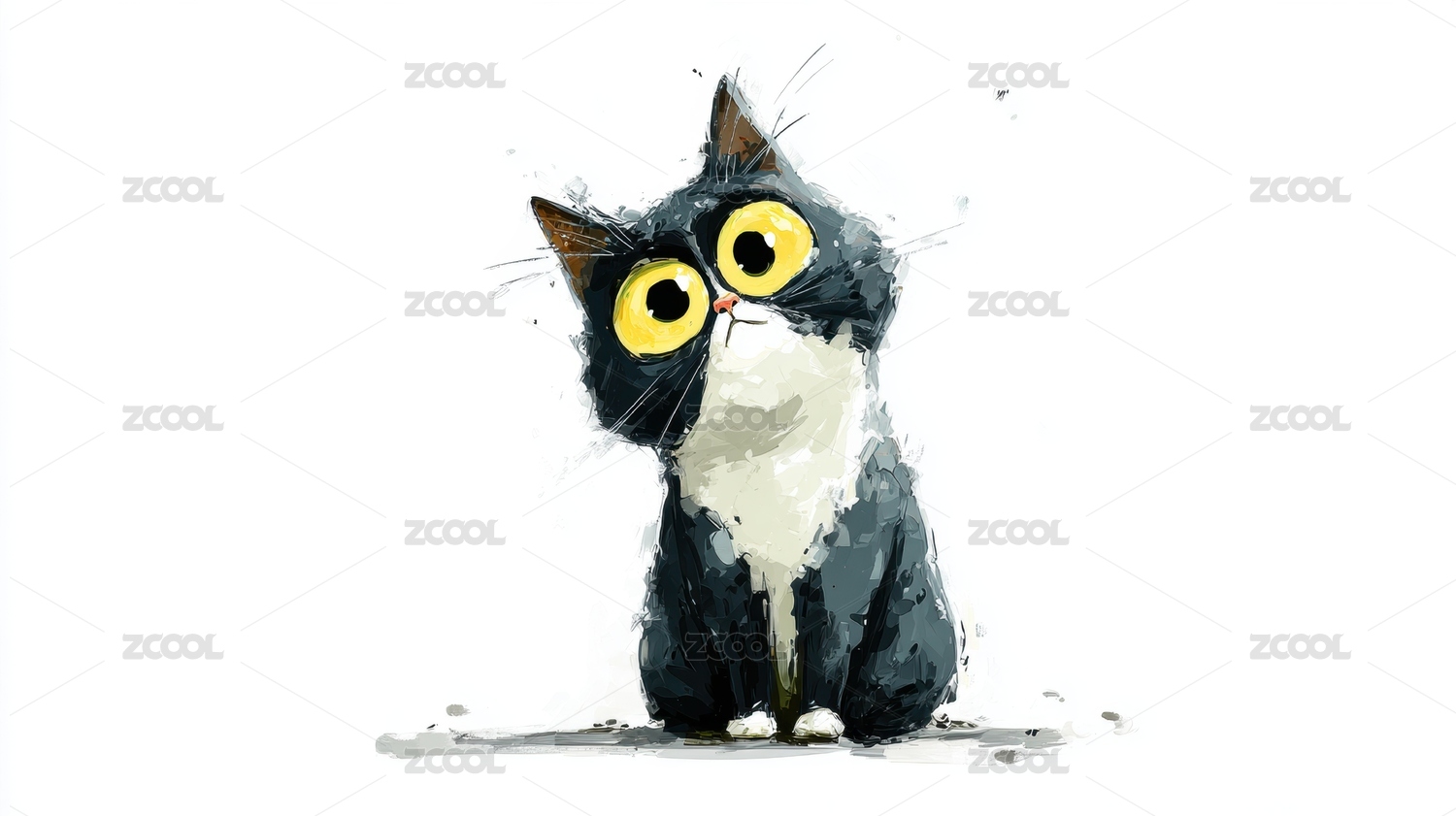 黑白猫坐姿水彩画