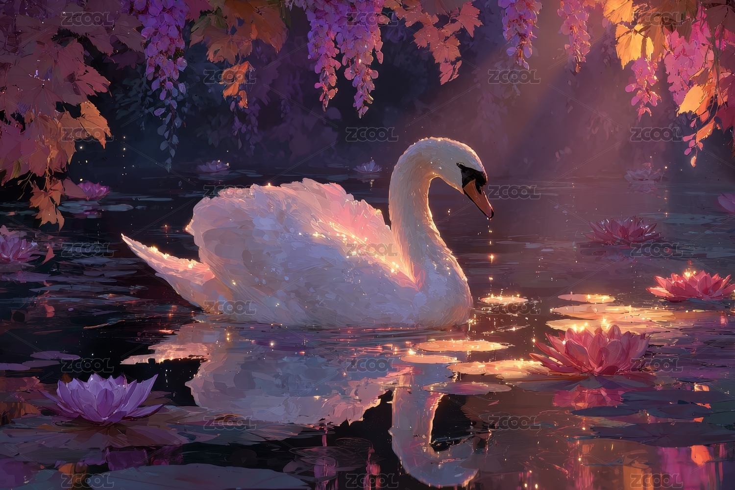 天鹅,玫瑰,优雅,白色,粉色,花朵,水面,倒影,自然,动物