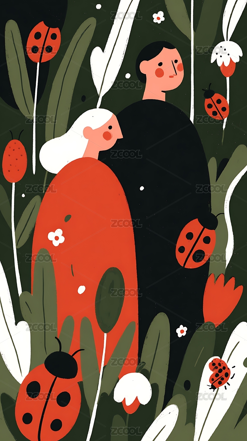 卡通,情侣,植物,花朵,田园,简单,黑衣,生活,瓢虫,园艺