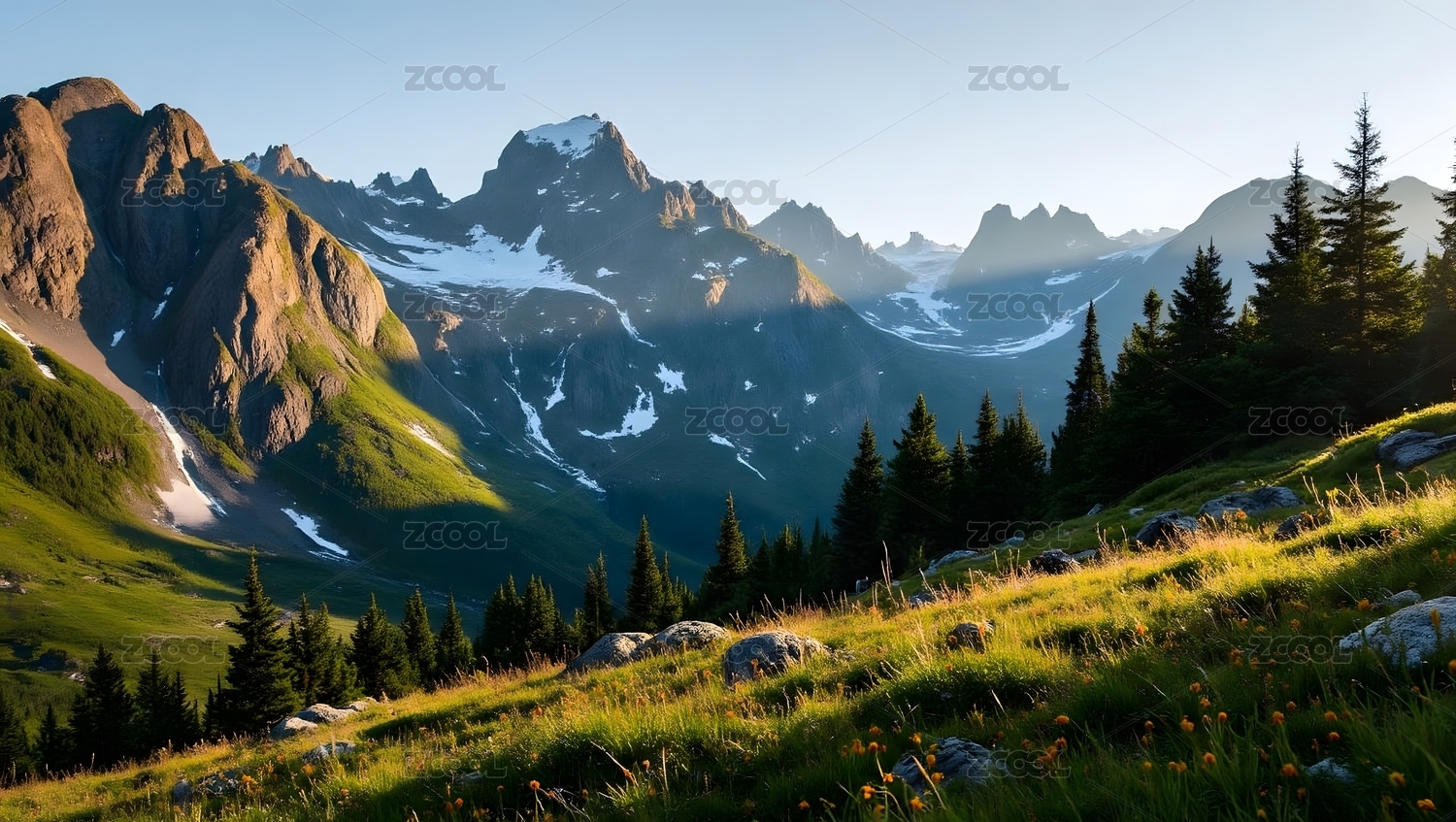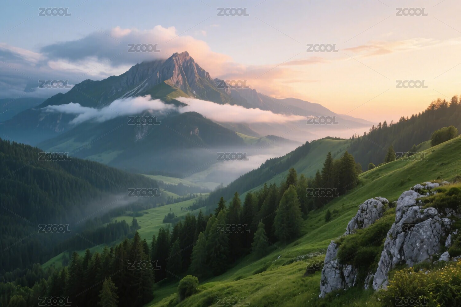 云朵,山脉,自然,阳光,岩石,森林,山谷,草地,松树,山峰