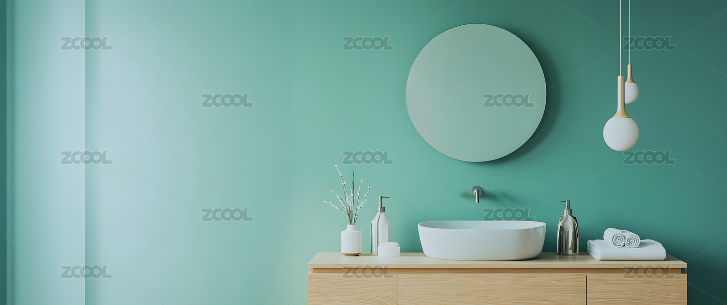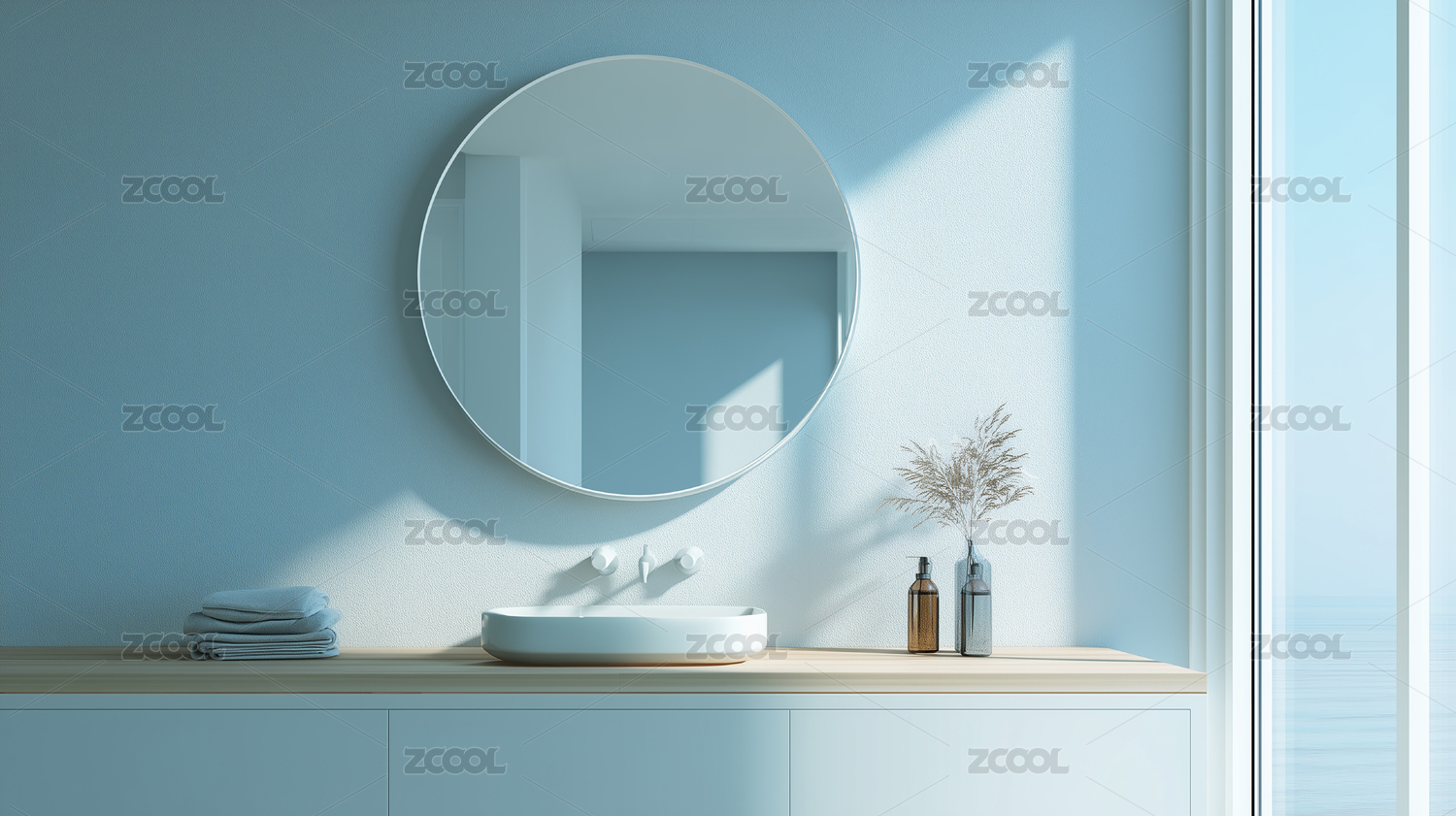 浴室,现代,镜子,圆形,极简,框架,白色,反光,光线,自然