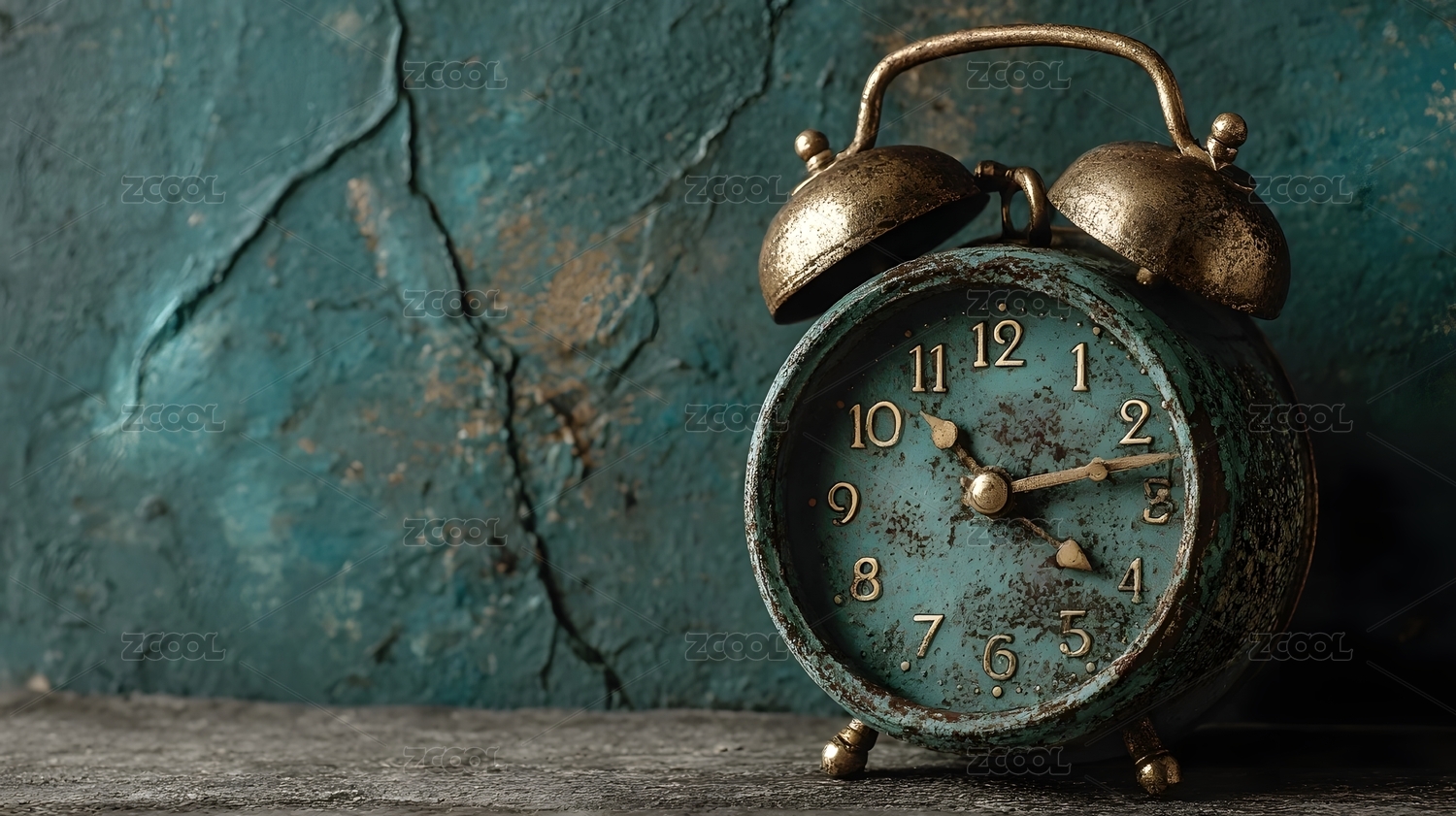 复古闹钟静置于绿墙前