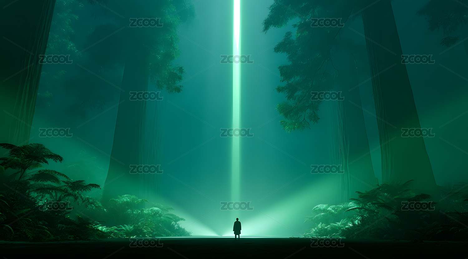 森林,树木,阳光,光束,雾气,人影,静谧,神秘,探索,冒险