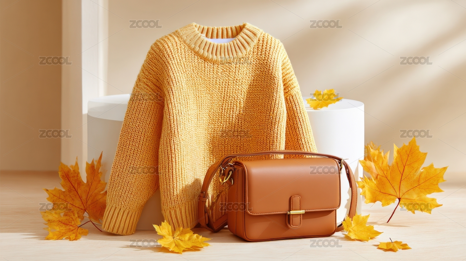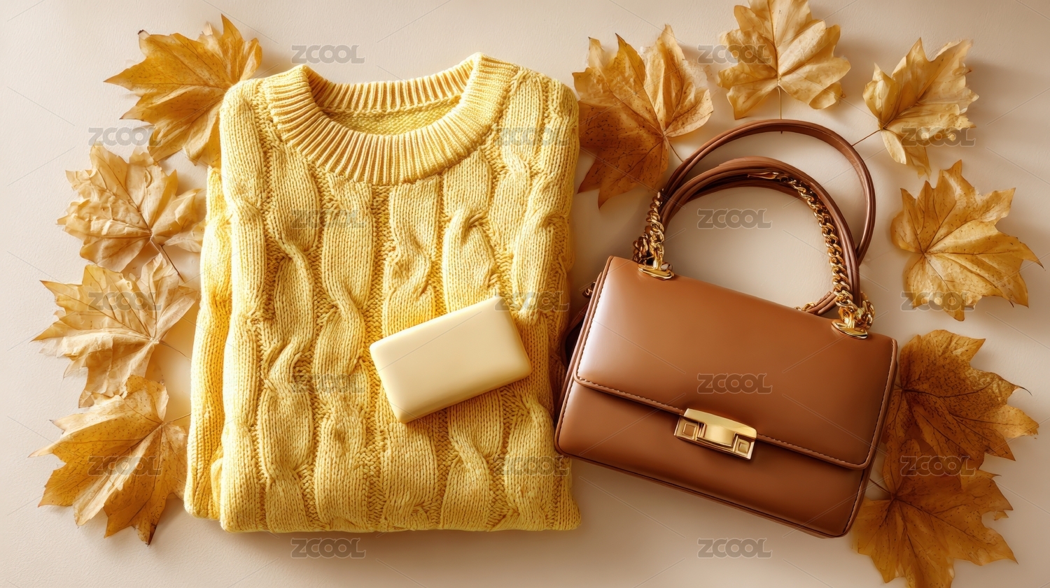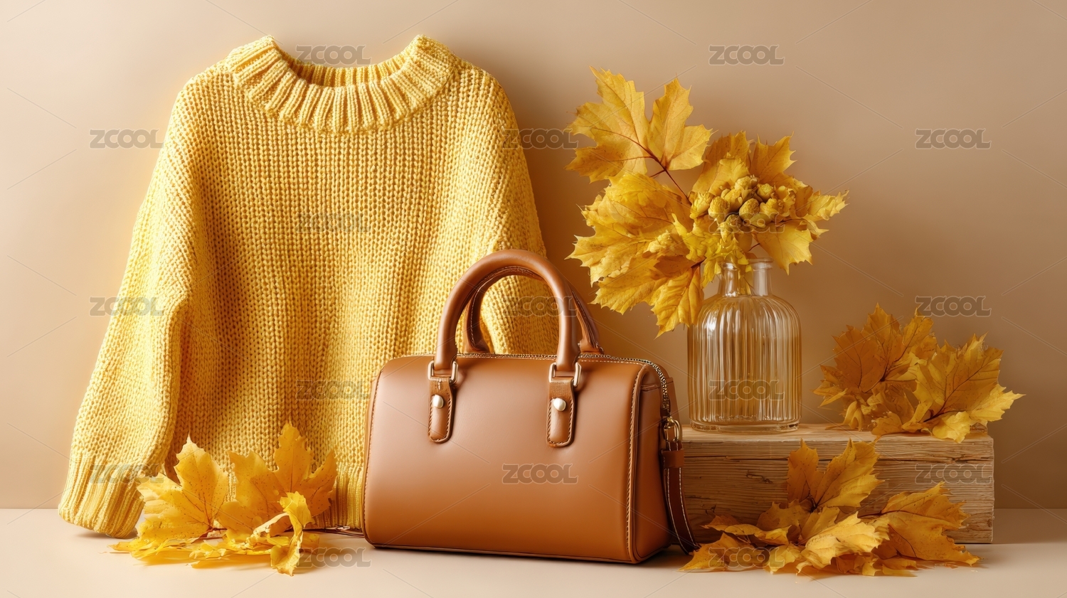 自然,毛衣,背包,落叶,秋季,温馨,棕调,编织,皮革,金黄