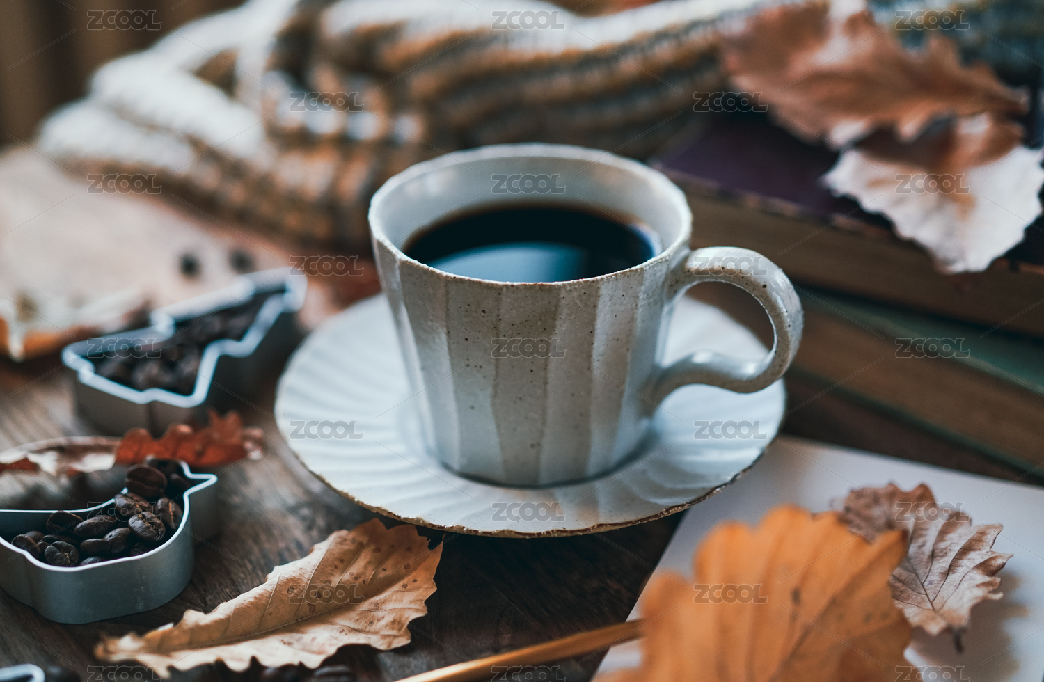 秋天枫叶和咖啡杯