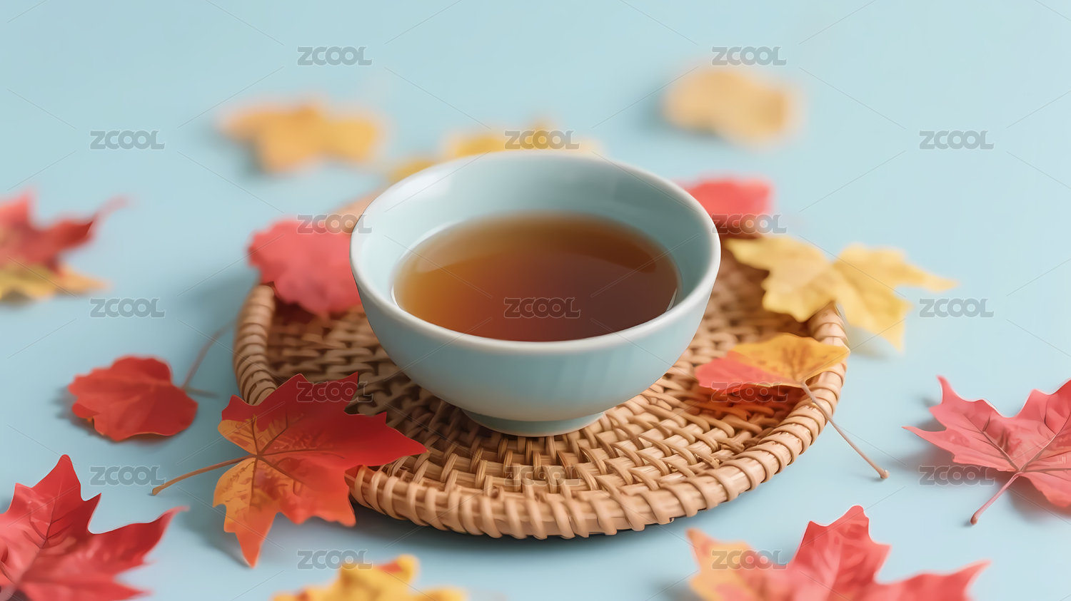 浅蓝茶碗与枫叶