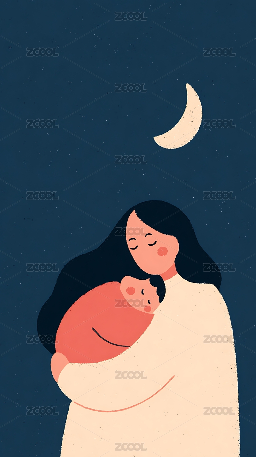 天空,宁静,人物,夜晚,温柔,母亲,孩子,拥抱,赏月,温暖