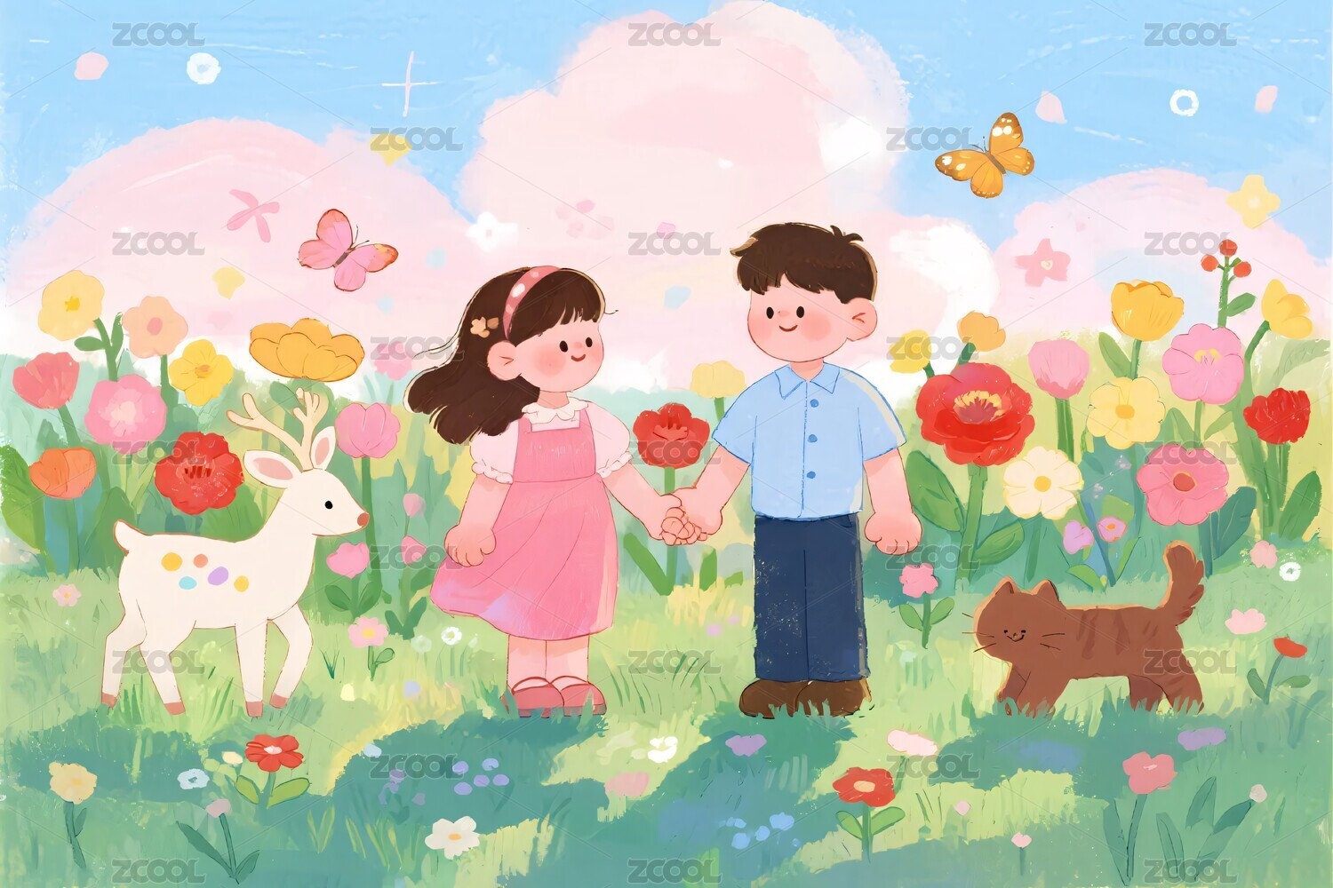 人物,可爱,孩子,卡通,快乐,瓢虫,友谊,玩耍,绿色,简单