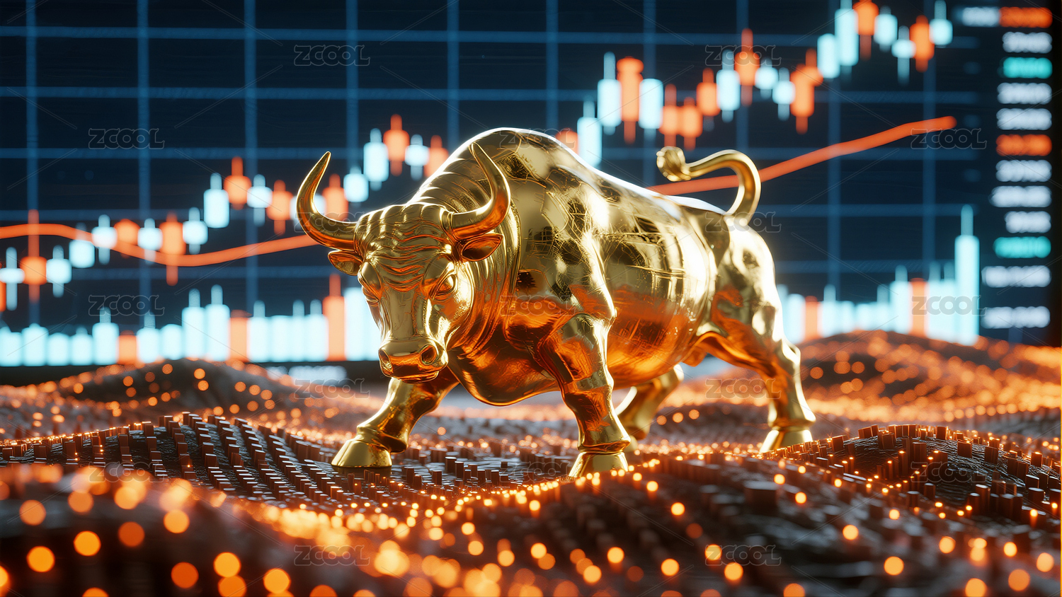 金色公牛在金融图表背景下立于发光地面