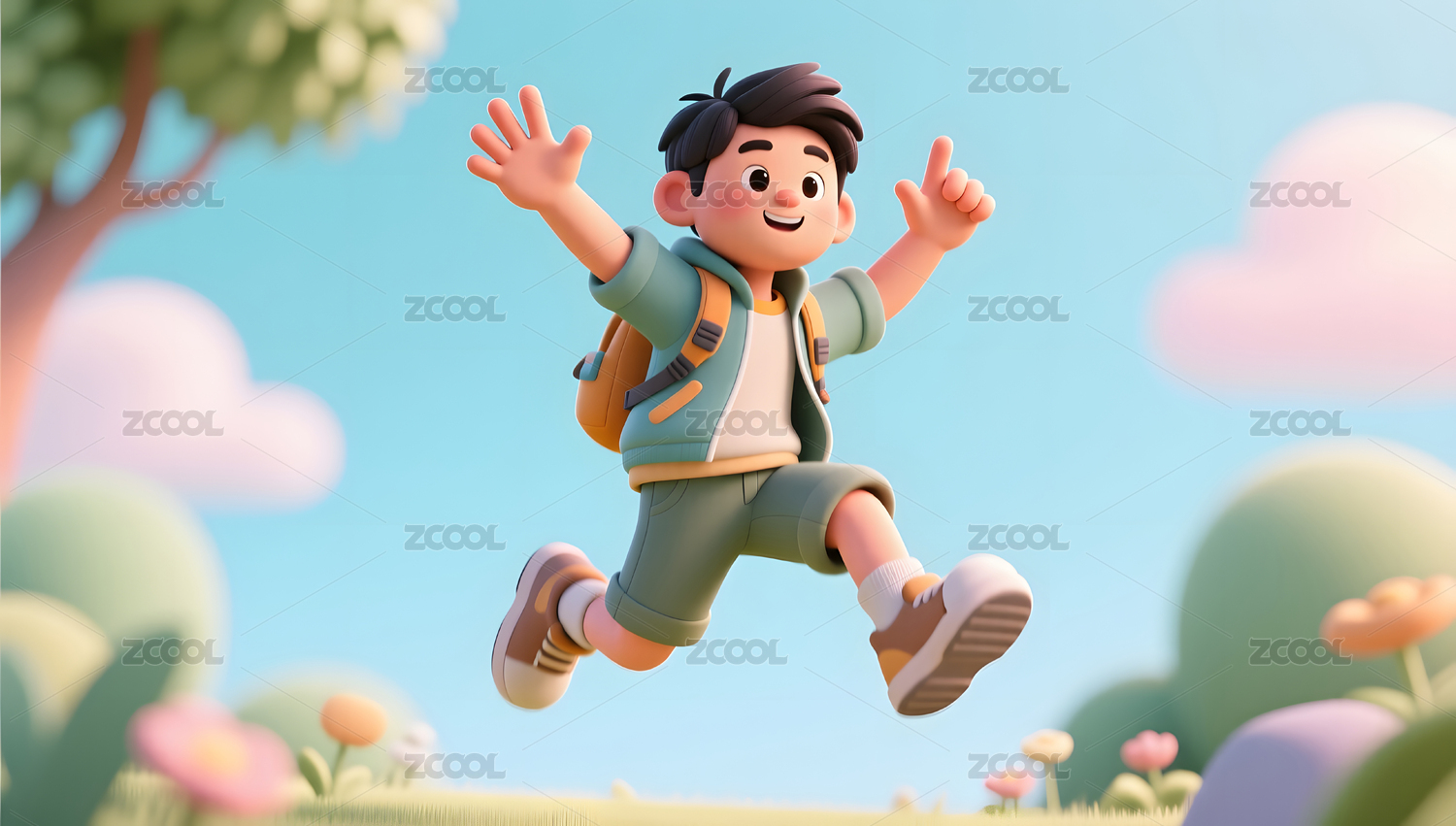 卡通,3D,男孩,学生,开学季,蓝天,白云,草地,白昼,书包