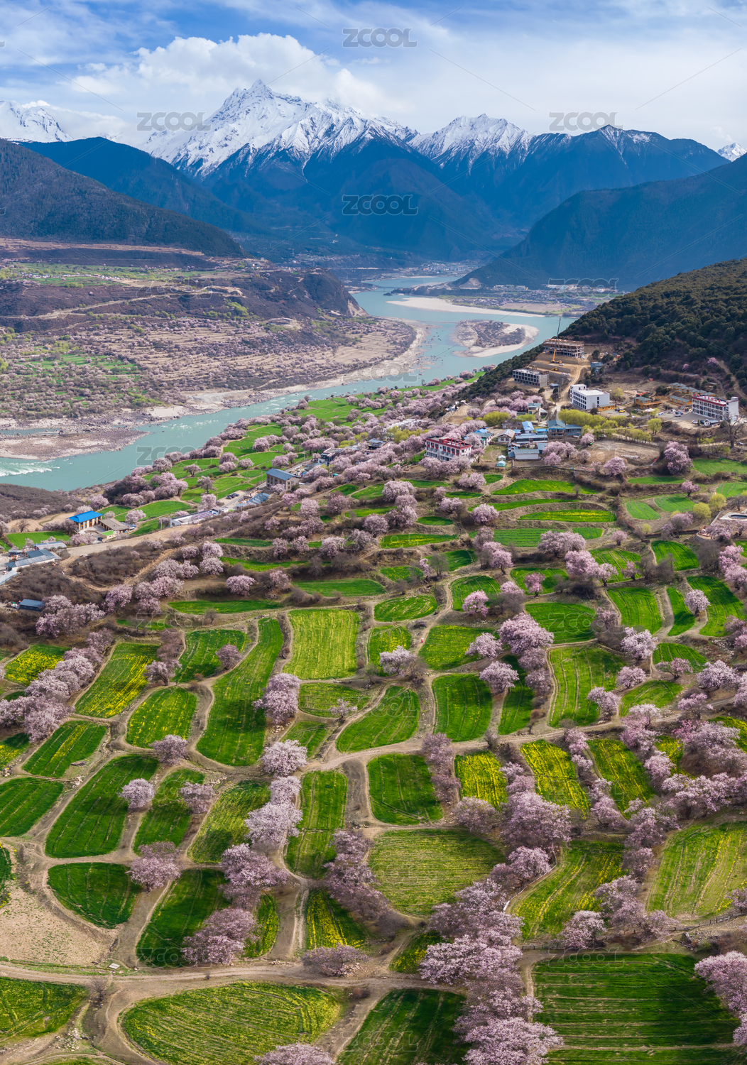 中国,西藏,林芝,波密,桃花沟,雪山,桃花,春天,农田,村庄