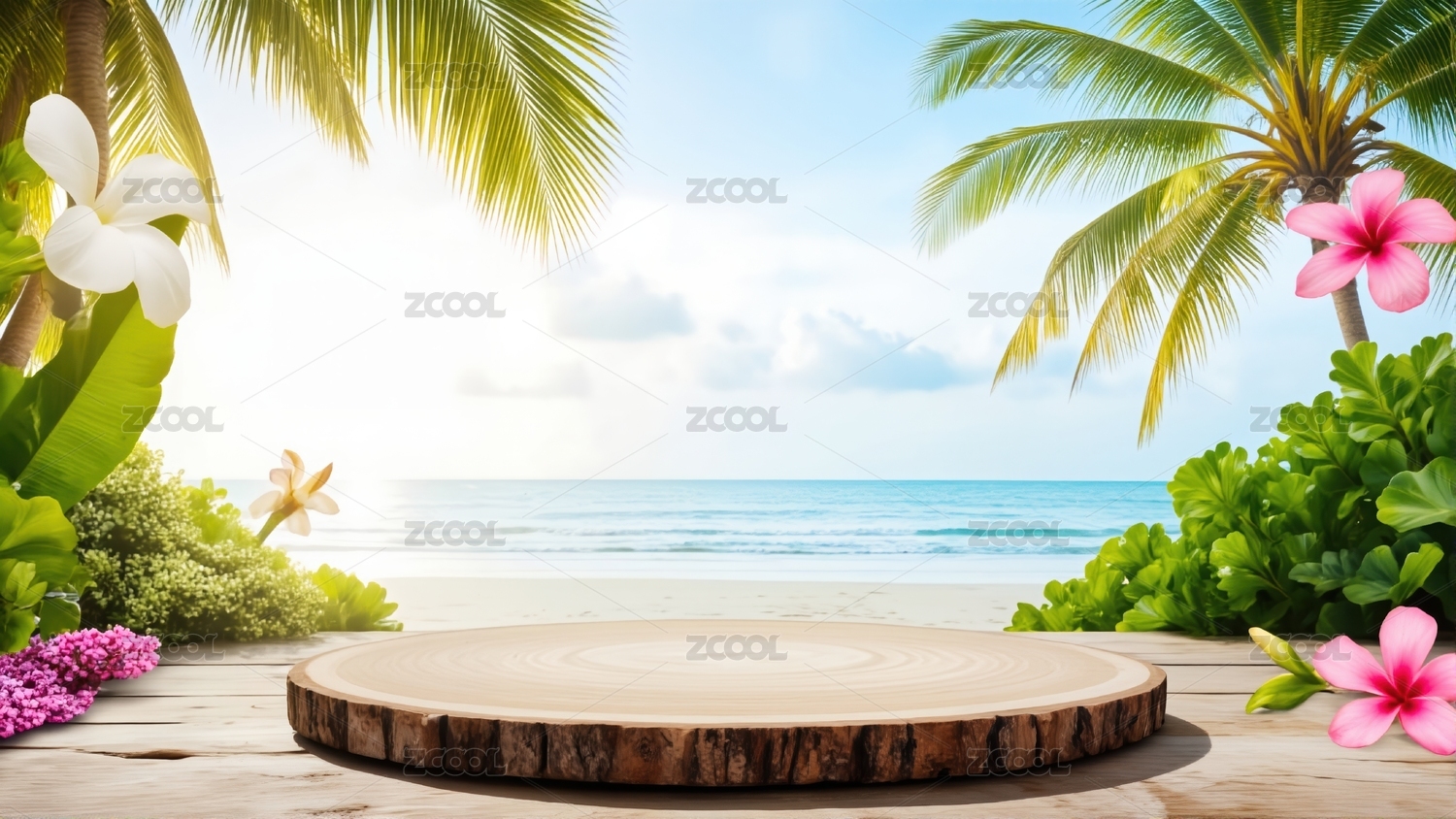 海边木台与烂漫花卉背景