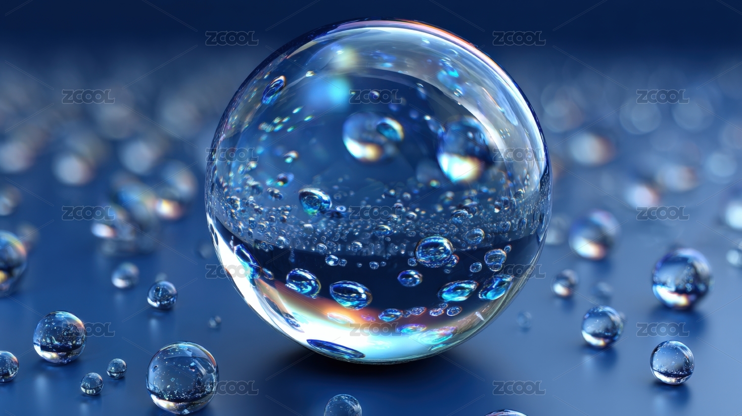 水珠晶莹剔透倒影蓝色背景