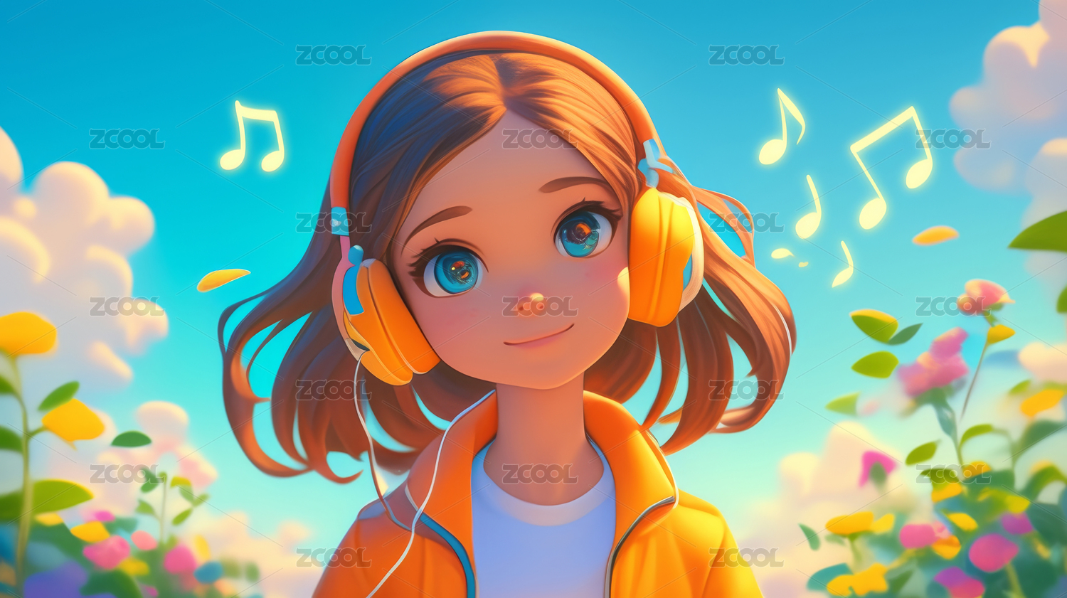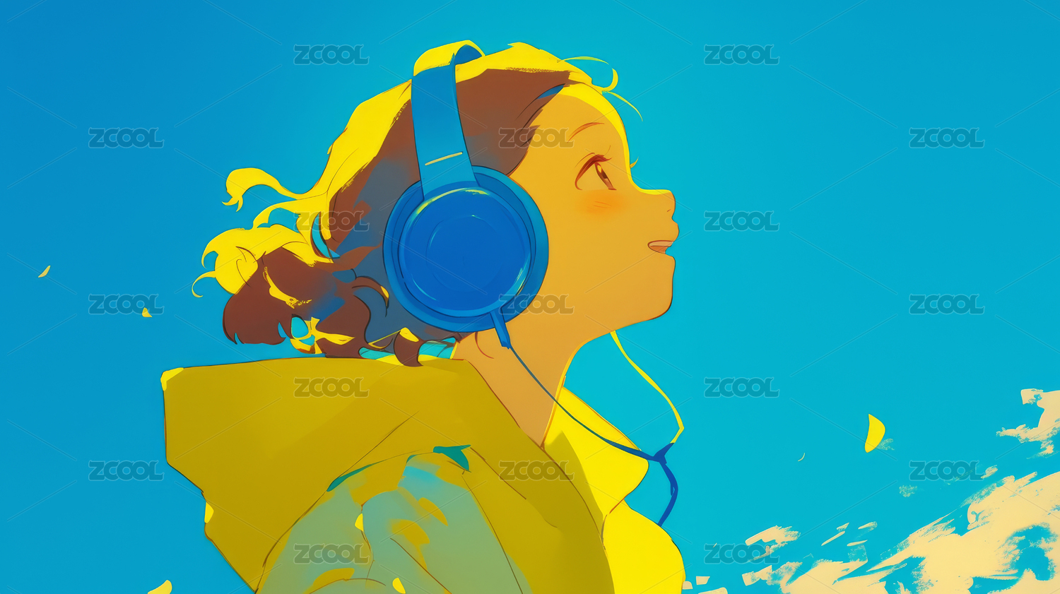 清新明亮戴耳机亚洲清纯女孩扁平动漫插画
