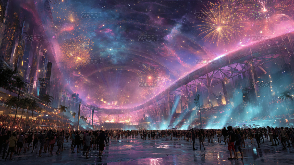 未来,城市,夜景,烟火,人群,聚集,现代建筑,宇宙天空,彩色灯光,庆典