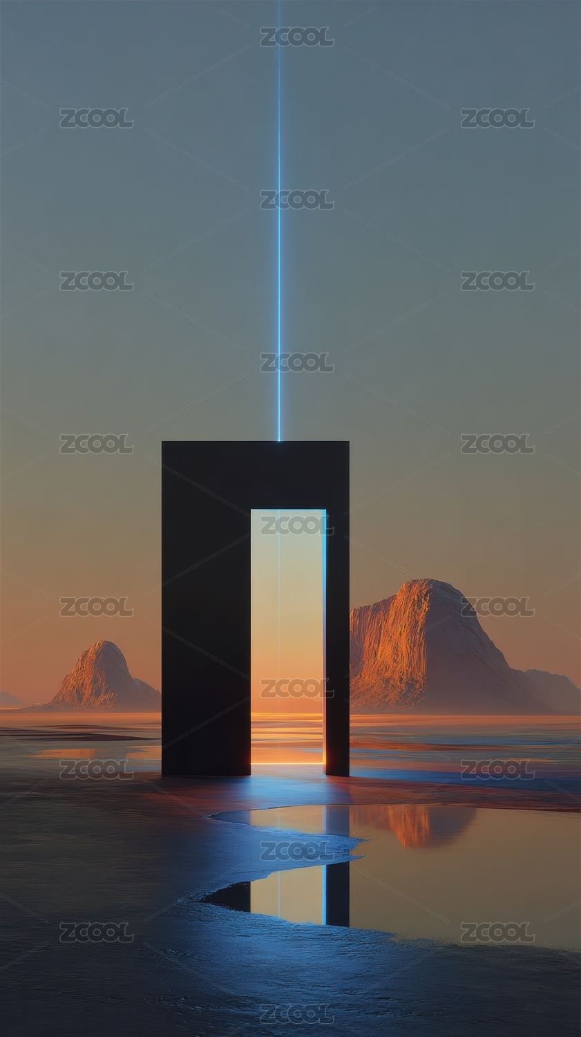 湖面山影与发光门框的奇幻景象