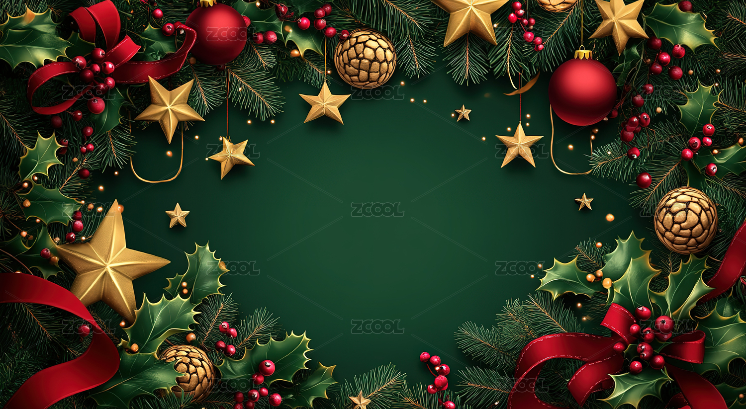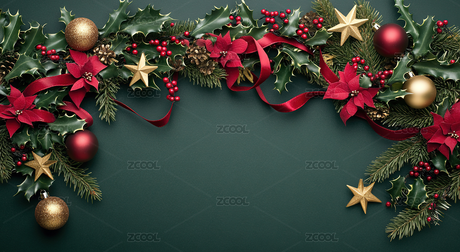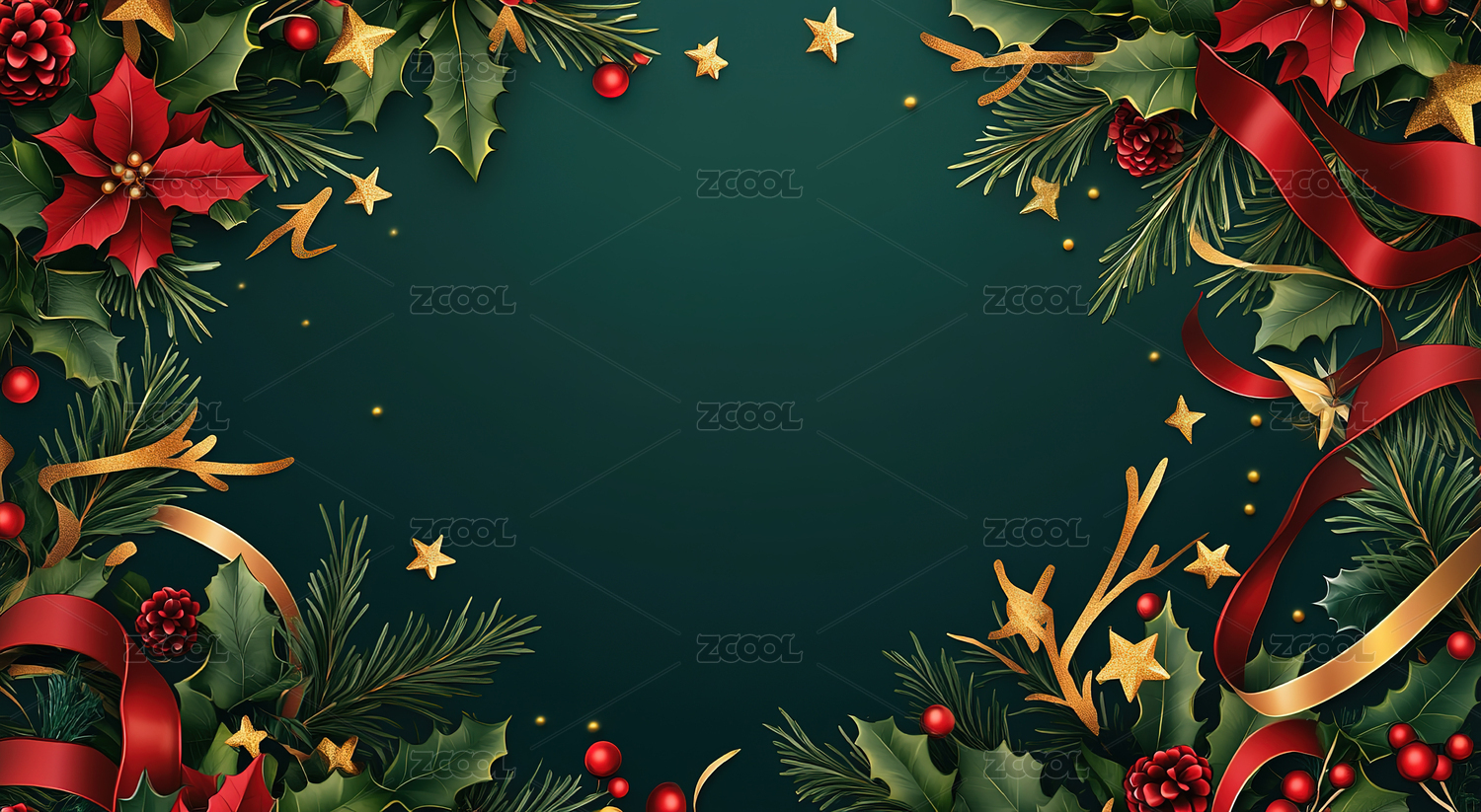 红色,金色,装饰,星星,圣诞花,装饰球,丝带,深绿,节日,气氛