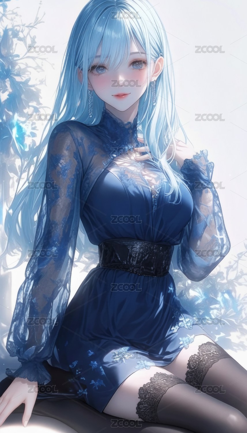 蓝发动漫少女穿优雅礼服