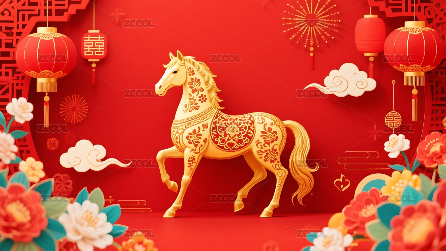 金色,骏马,红色,背景,灯笼,云朵,元宝,节日,传统,文化