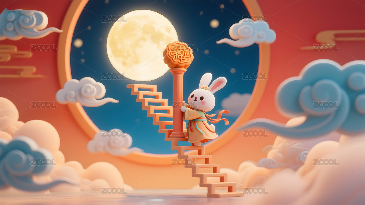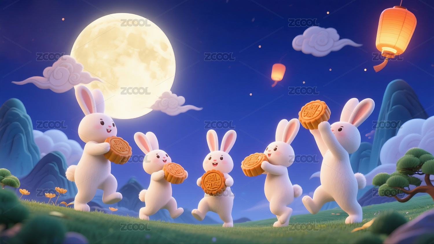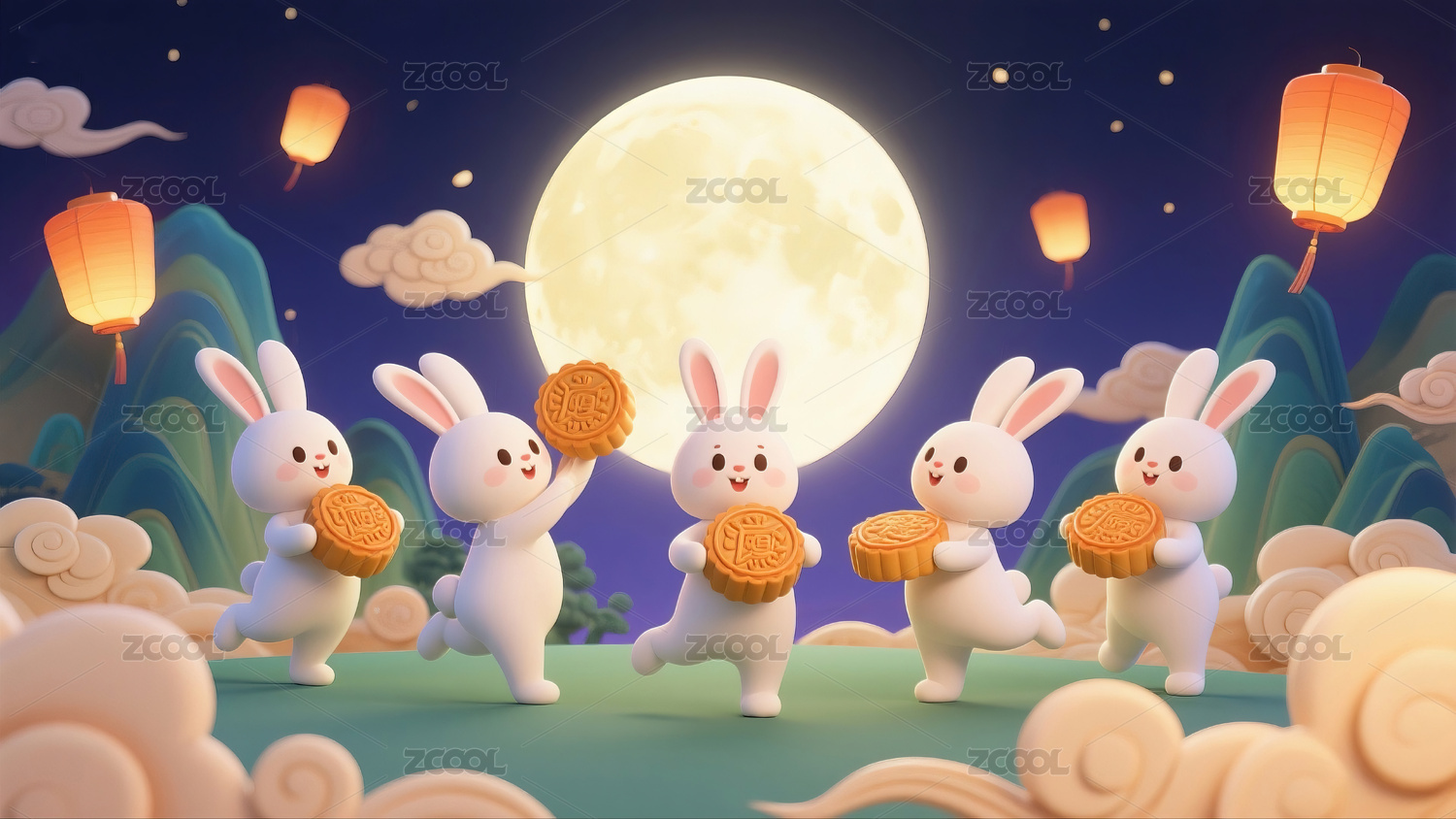 3D,三维,中秋节,月饼,食物,满月,玉兔,兔子