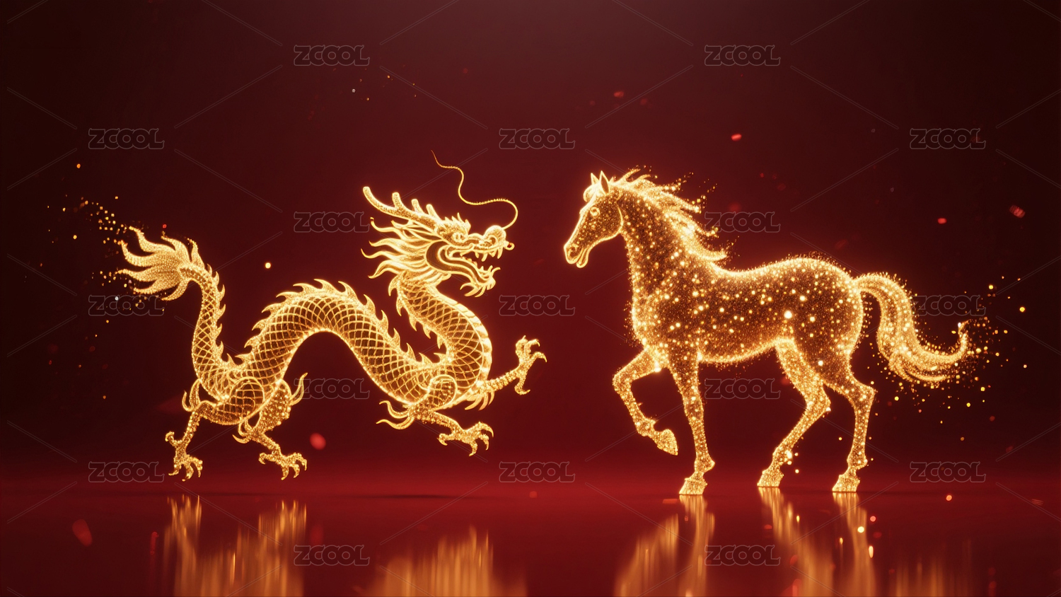龙马精神,龙,中国龙,马,马年,抽象,插画,粒子,金色,红色