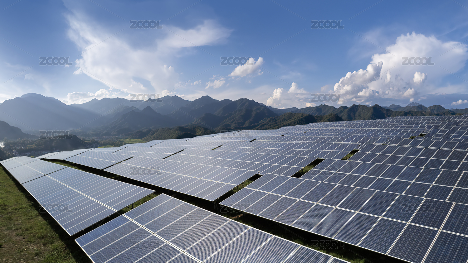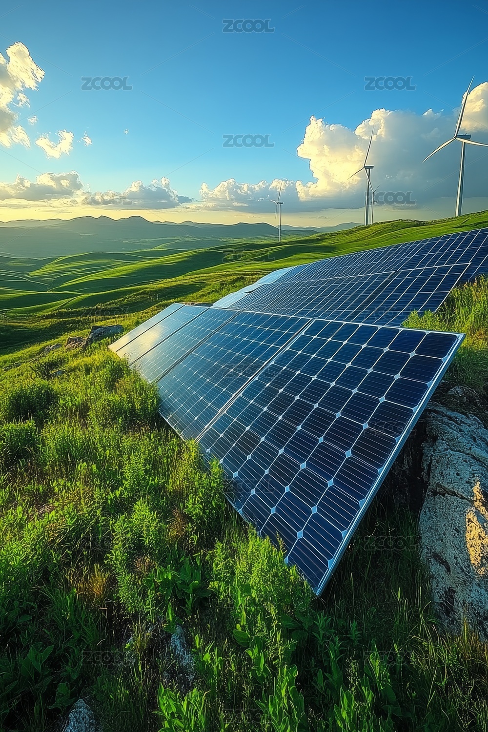 太阳能电池板,田野,蓝天,白云,阳光,自然,风景,绿色,能源,插画