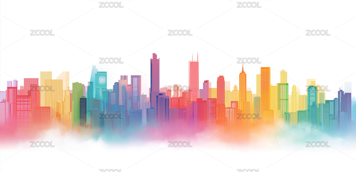 彩色渐变城市天际线水彩插画设计