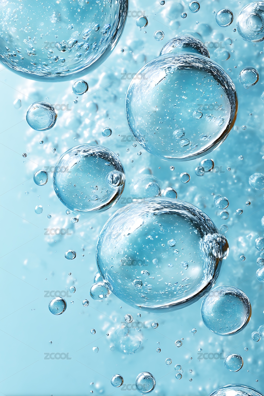 透明水珠悬浮在浅蓝色背景中